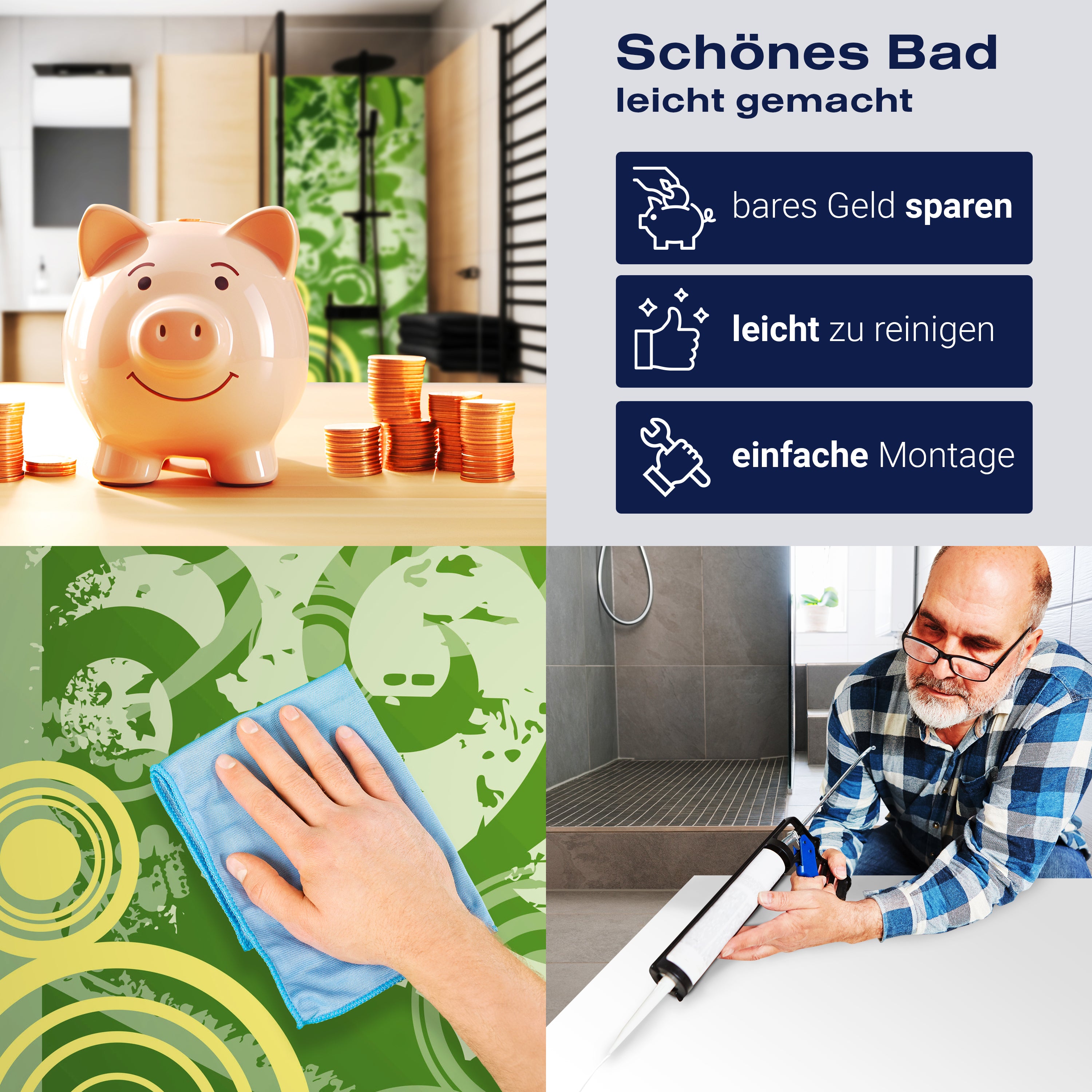 Die Reinigung Deiner Duschwand war noch nie so einfach. In einer Welt, in der Zeit ein kostbares Gut ist, verstehen wir, wie wichtig es ist, Reinigungsprozesse so effizient und mühelos wie möglich zu gestalten. Unsere Duschwände sind speziell dafür entworfen, Dein Leben leichter zu machen. Dank der glatten Oberfläche und der widerstandsfähigen Beschichtung lassen sich Spritzer und Flecken ohne großen Aufwand entfernen – ein schneller Wisch mit einem handelsüblichen Lappen, Spül- oder Wischtuch, und Deine Rückwand sieht aus wie neu.