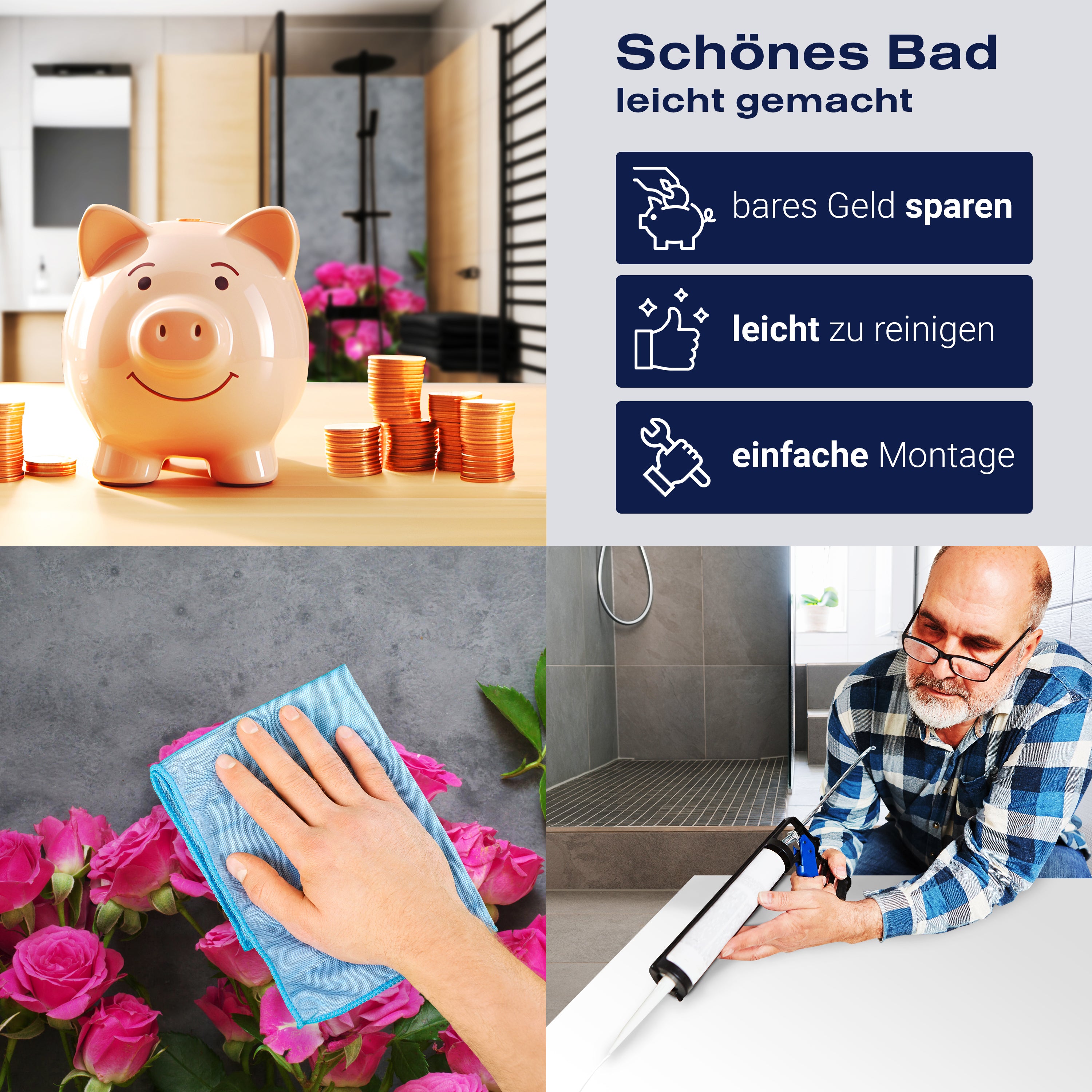 Die Reinigung Deiner Duschwand war noch nie so einfach. In einer Welt, in der Zeit ein kostbares Gut ist, verstehen wir, wie wichtig es ist, Reinigungsprozesse so effizient und mühelos wie möglich zu gestalten. Unsere Duschwände sind speziell dafür entworfen, Dein Leben leichter zu machen. Dank der glatten Oberfläche und der widerstandsfähigen Beschichtung lassen sich Spritzer und Flecken ohne großen Aufwand entfernen – ein schneller Wisch mit einem handelsüblichen Lappen, Spül- oder Wischtuch, und Deine Rückwand sieht aus wie neu.