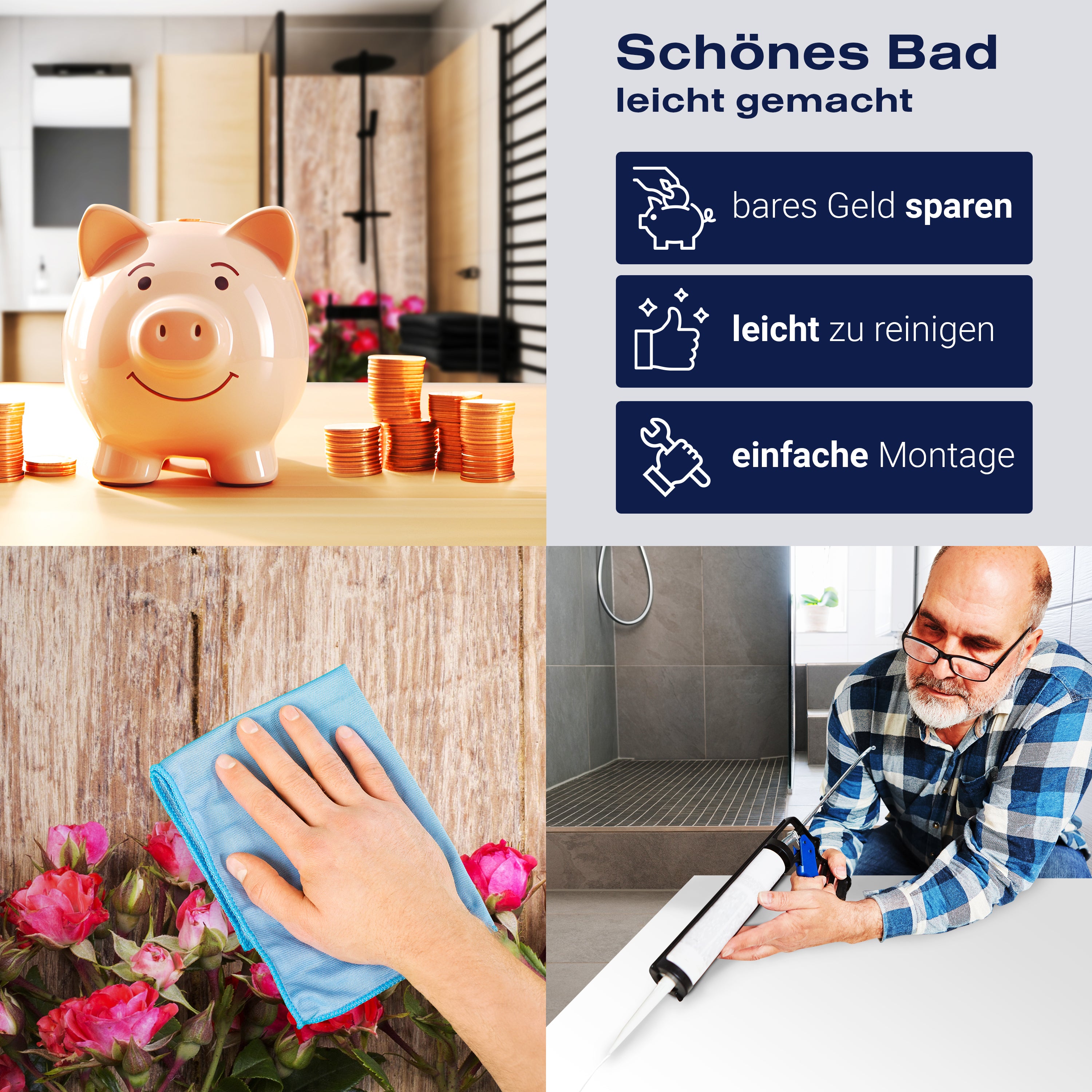 Diese Materialien bieten im Vergleich zu traditionellen Fliesen mehrere Vorteile. Sie haben eine fugenlose Oberfläche, was bedeutet, dass sie weniger anfällig für Schimmelbildung und leichter zu reinigen sind, da sich Schmutz und Kalk nicht in Fugen festsetzen können. Darüber hinaus ermöglichen sie eine schnelle und einfache Renovierung, da sie direkt über bestehenden Fliesen montiert werden können, was Zeit und Kosten spart