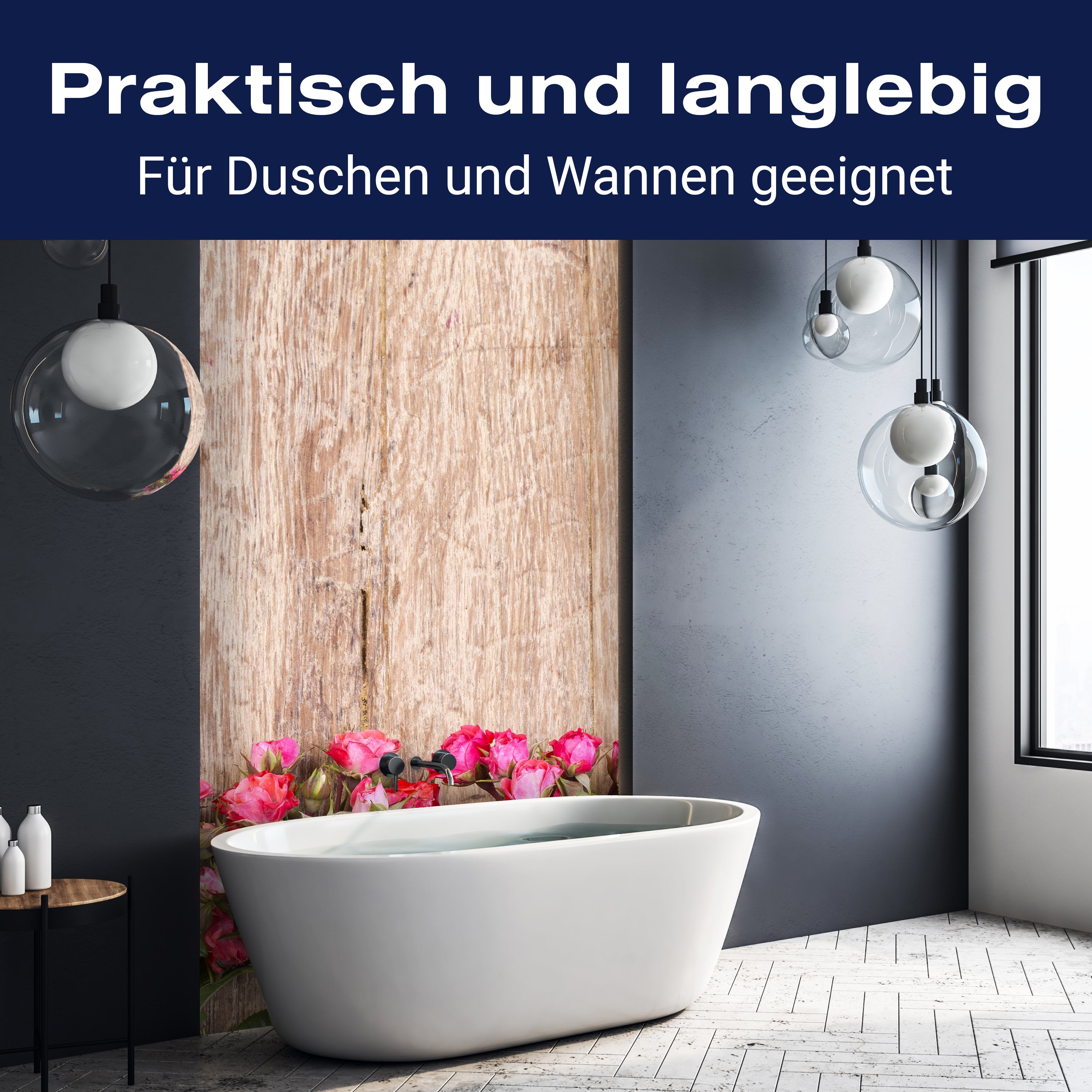 Bist du es leid, auf die langweiligen, schwer zu reinigende Fliesen in deiner Dusche zu schauen? Stell dir vor, wie dein Bad mit einer stilvollen, modernen Rückwand zum Leben erwacht! Unsere Duschwand 'Rote Rosen auf Holzbrett' ist nicht nur ein optisches Highlight, sondern auch praktisch und pflegeleicht.
