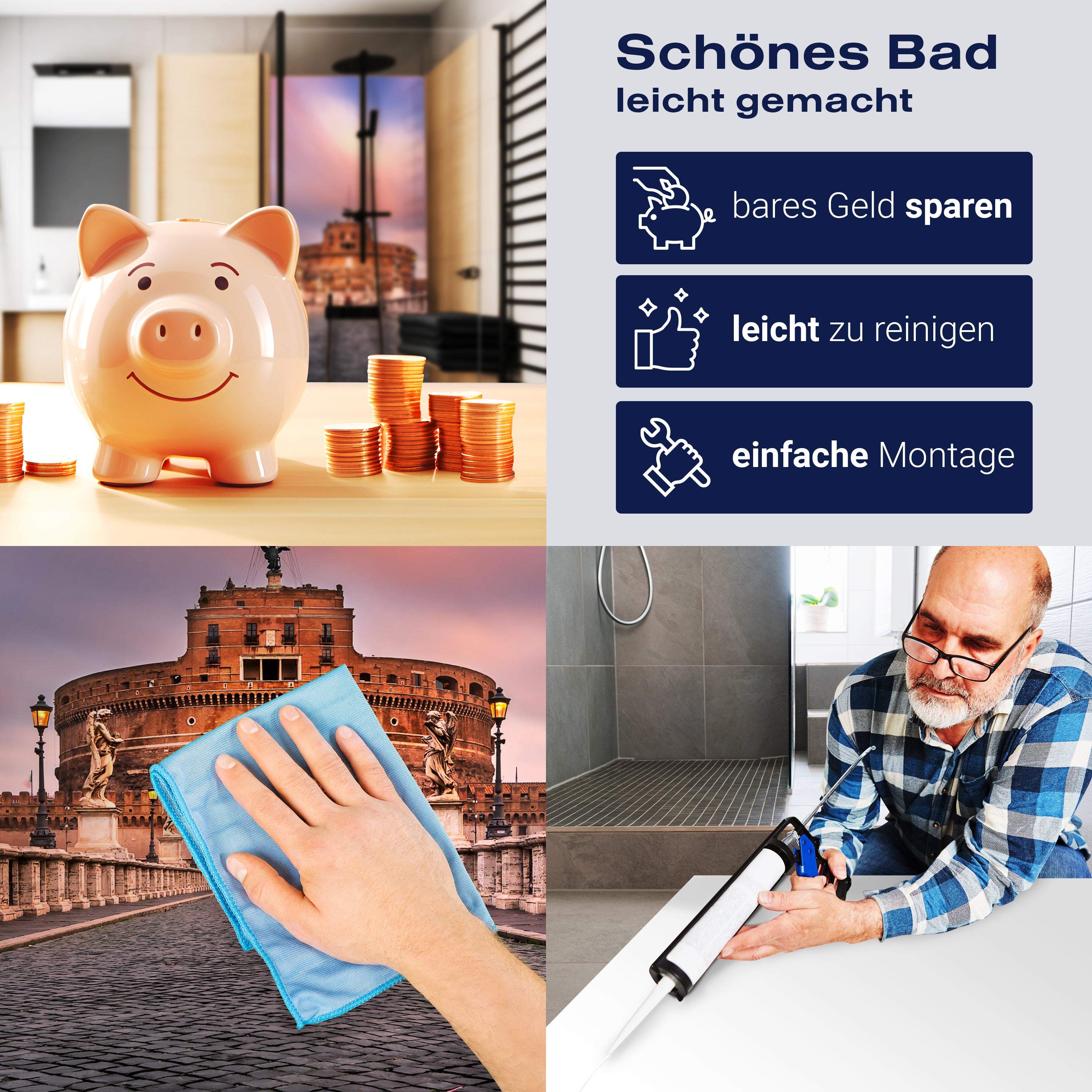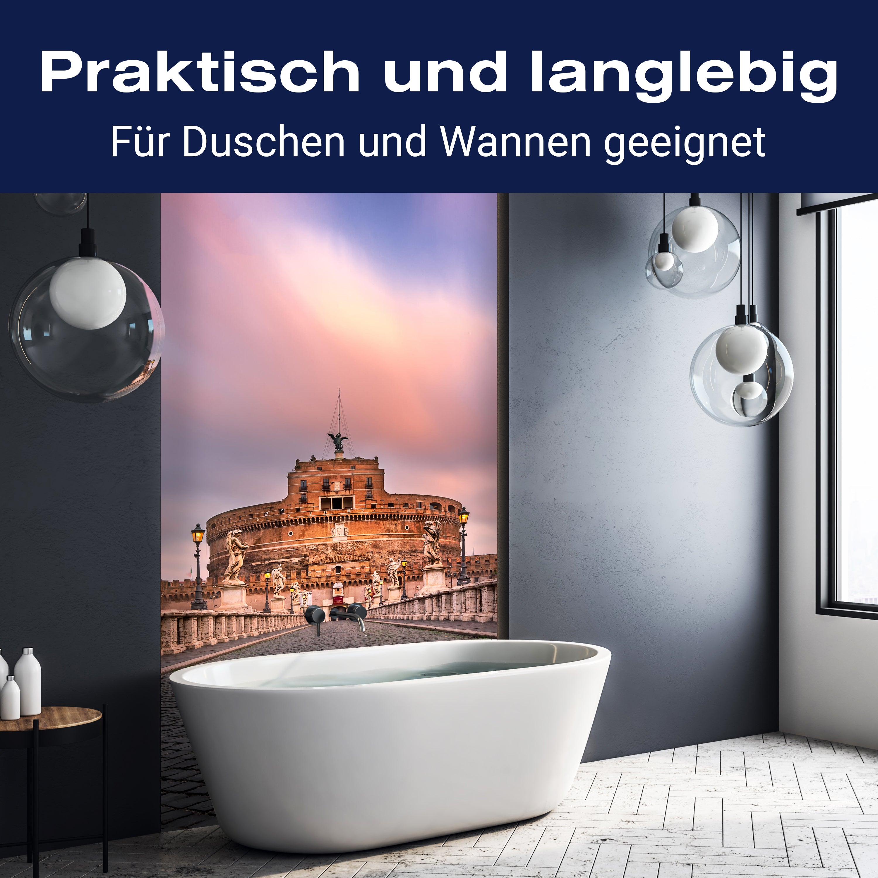 Bist du es leid, auf die langweiligen, schwer zu reinigende Fliesen in deiner Dusche zu schauen? Stell dir vor, wie dein Bad mit einer stilvollen, modernen Rückwand zum Leben erwacht! Unsere Duschwand 'Sant Angelo Brücke und Schloss, Rom' ist nicht nur ein optisches Highlight, sondern auch praktisch und pflegeleicht.