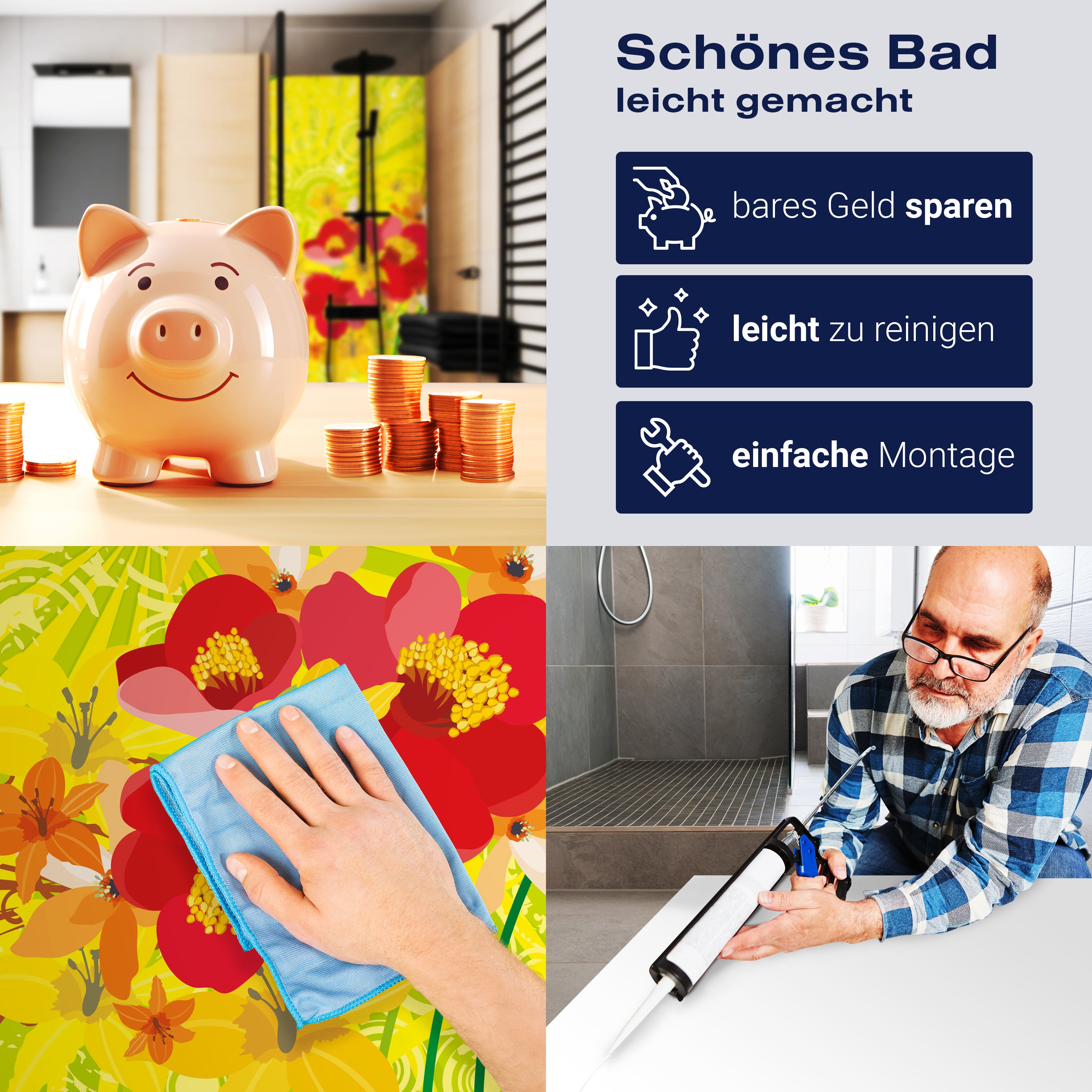 Bist du es leid, auf die langweiligen, schwer zu reinigende Fliesen in deiner Dusche zu schauen? Stell dir vor, wie dein Bad mit einer stilvollen, modernen Rückwand zum Leben erwacht! Unsere Duschwand 'Sara Floral' ist nicht nur ein optisches Highlight, sondern auch praktisch und pflegeleicht.