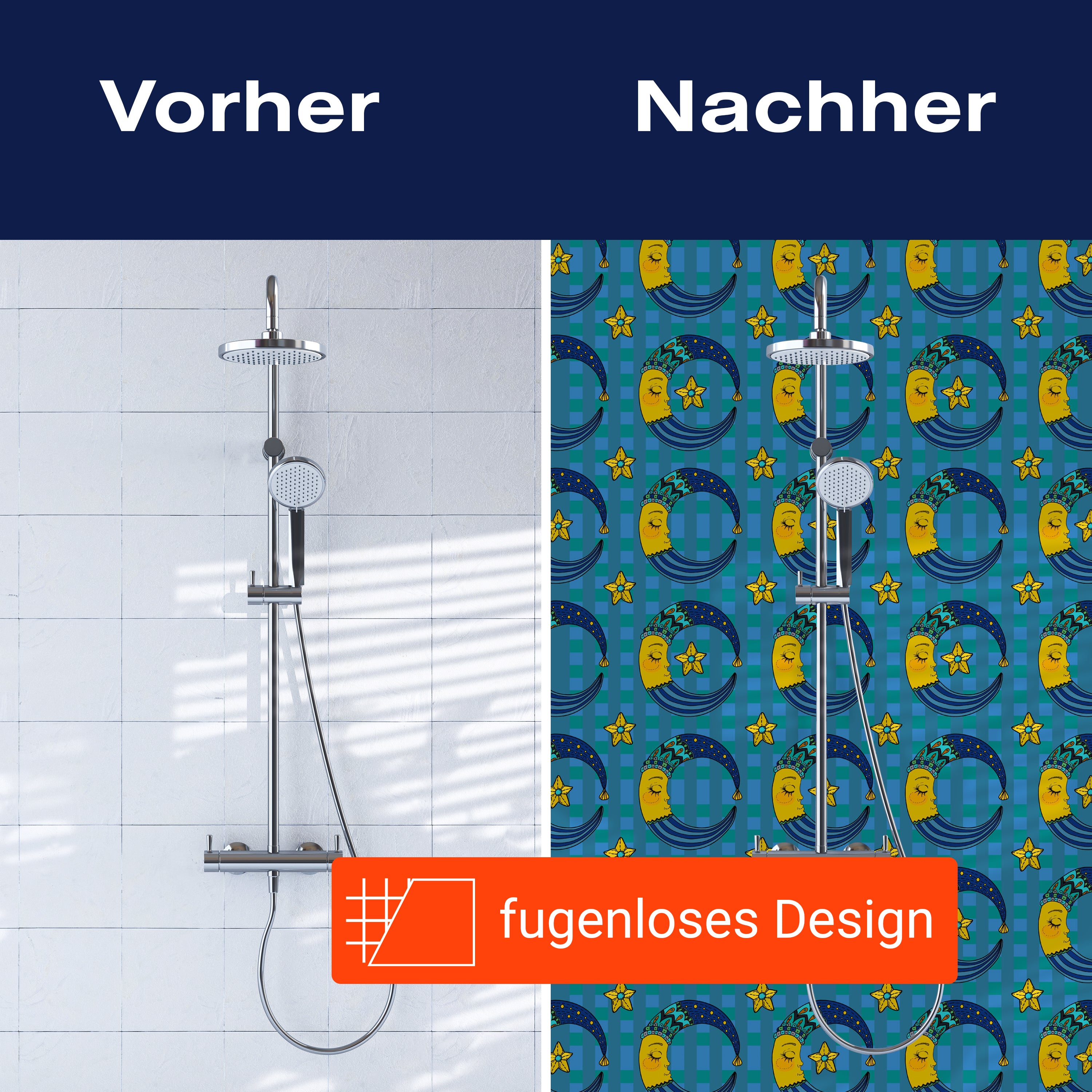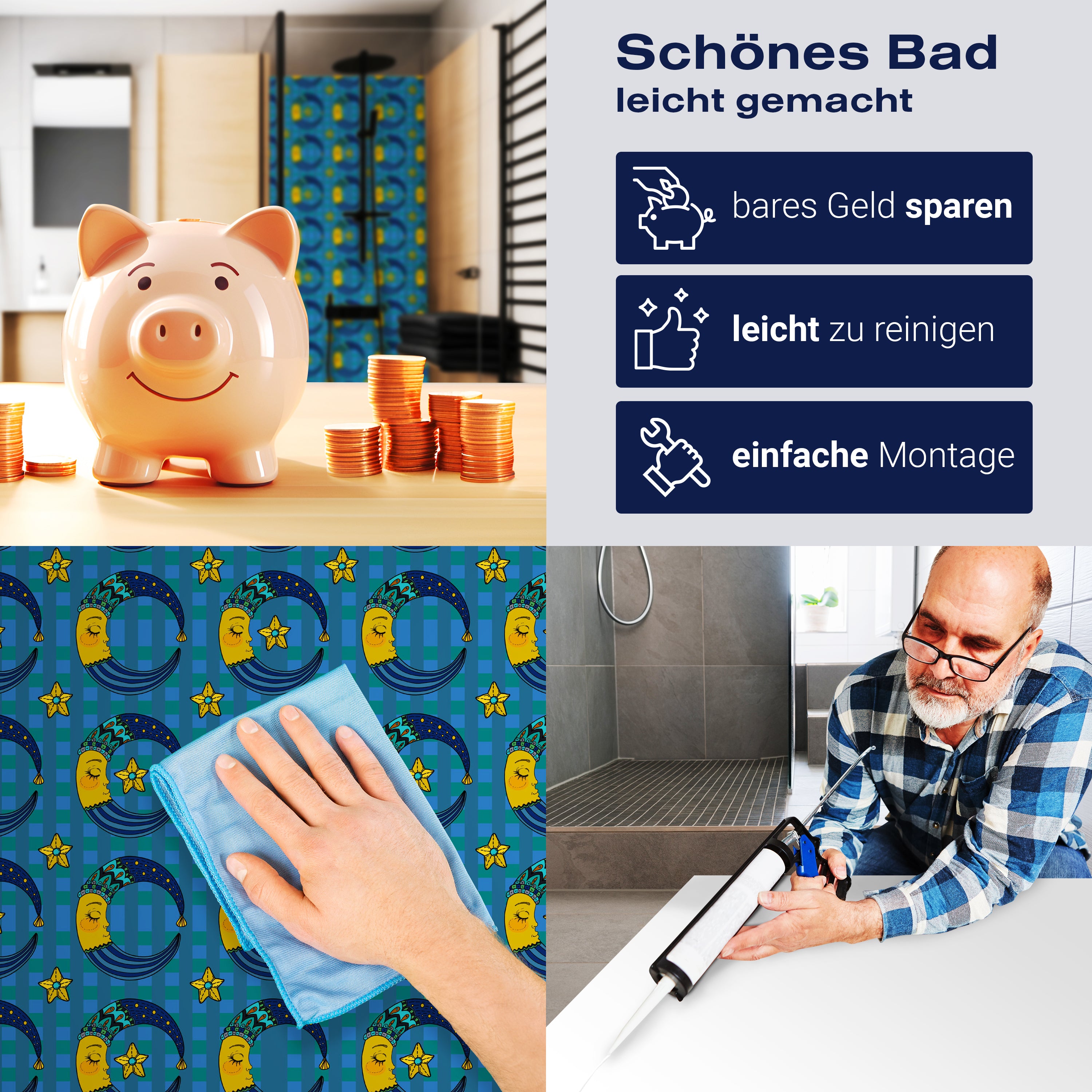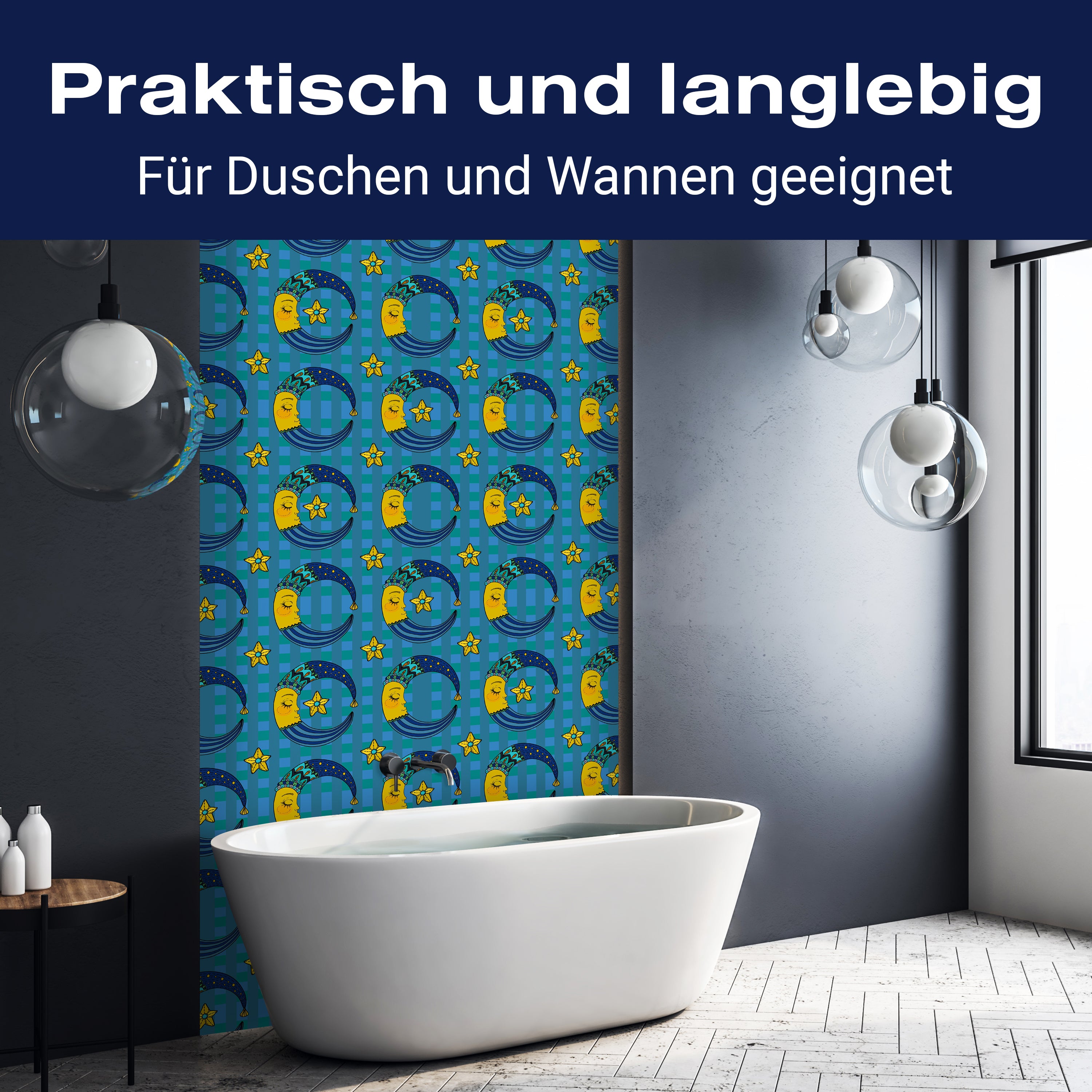 Vergiss die Tage, an denen Spritzer und Flecken deine Dusche ruiniert haben. Mit der Duschrückwand 'Schläfriger Mond' gehören solche Sorgen der Vergangenheit an. Das hochwertige Material sorgt dafür, dass deine Dusche gegen Wasser und andere alltägliche Missgeschicke resistent ist. Ein einfacher Wisch, und sie sieht aus wie neu – ohne den Einsatz von aggressiven Reinigungsmitteln.