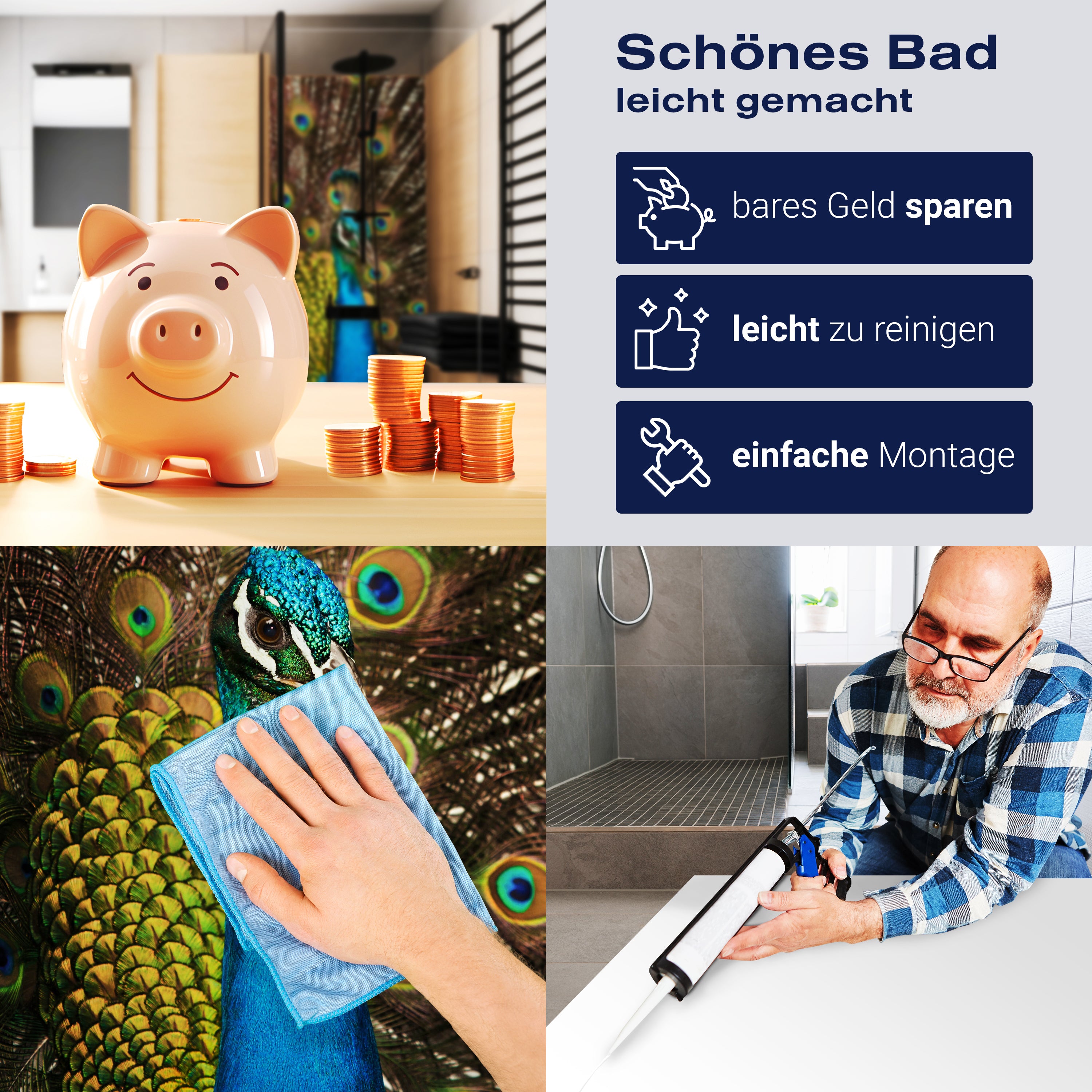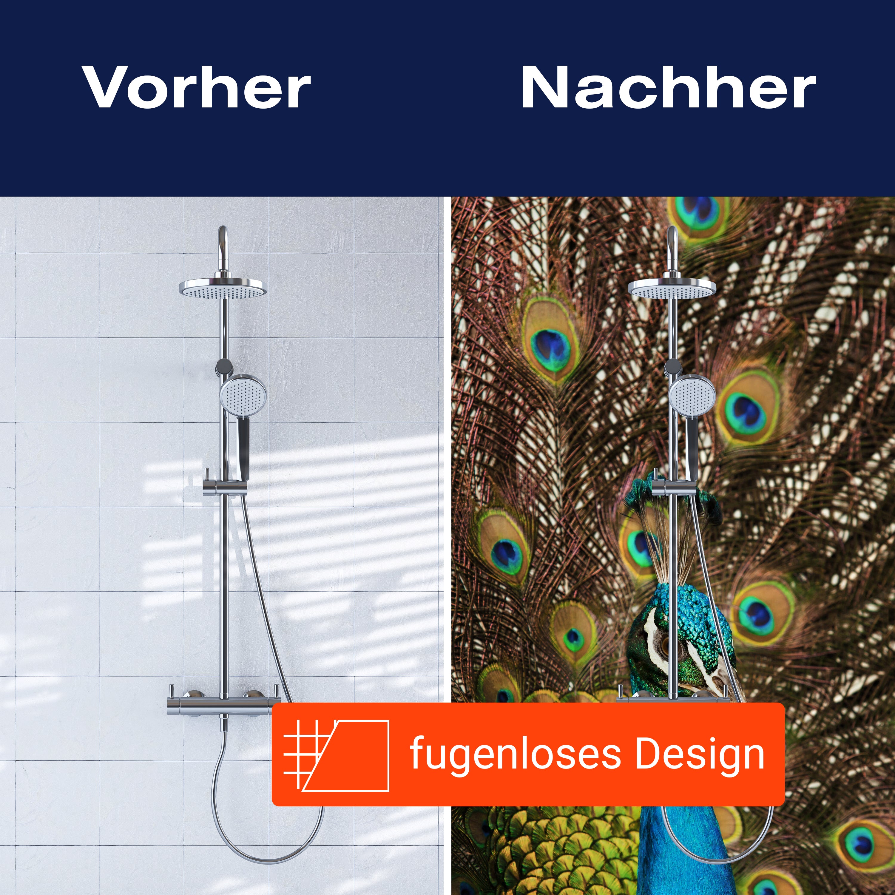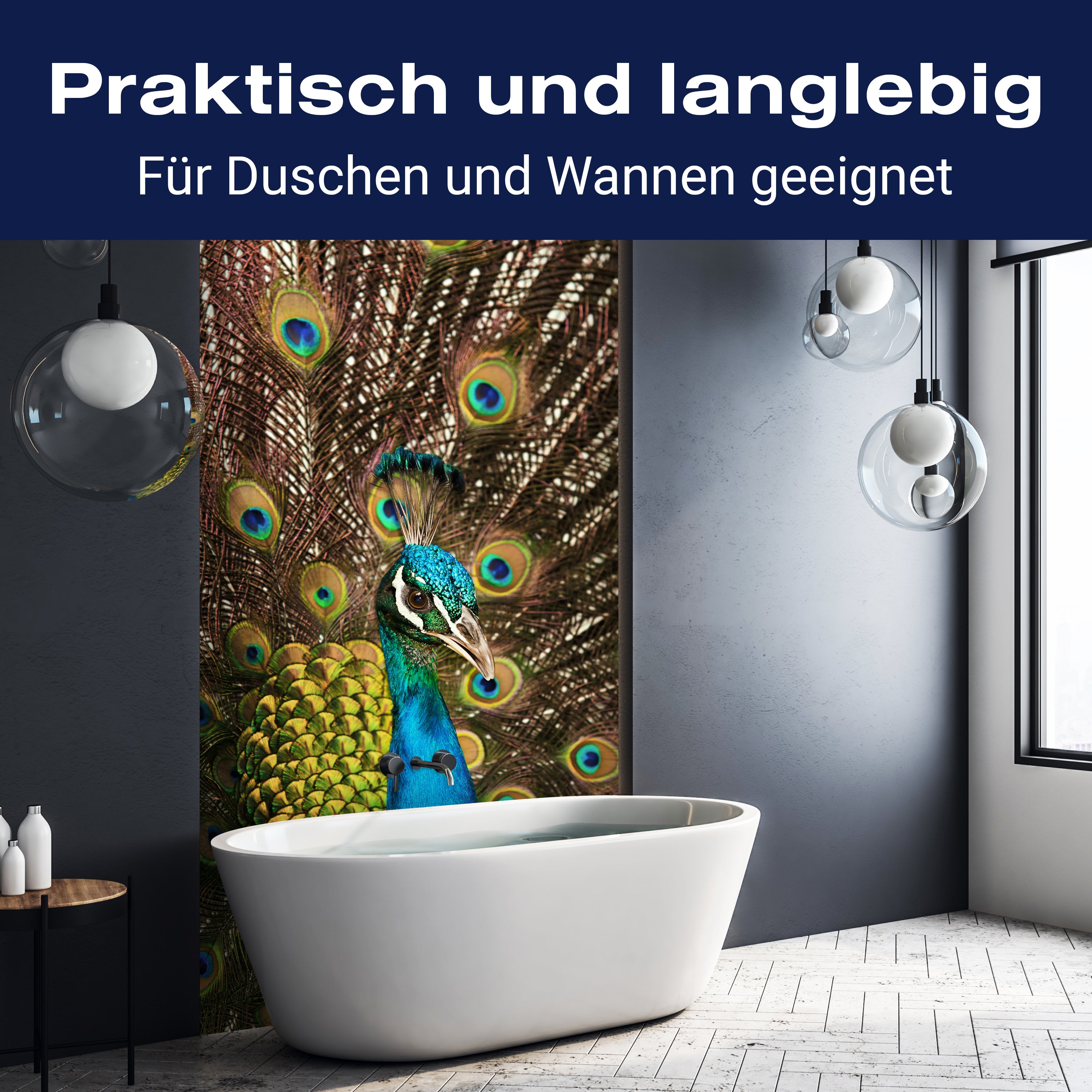 Bist du es leid, auf die langweiligen, schwer zu reinigende Fliesen in deiner Dusche zu schauen? Stell dir vor, wie dein Bad mit einer stilvollen, modernen Rückwand zum Leben erwacht! Unsere Duschwand 'schöner Pfau' ist nicht nur ein optisches Highlight, sondern auch praktisch und pflegeleicht.