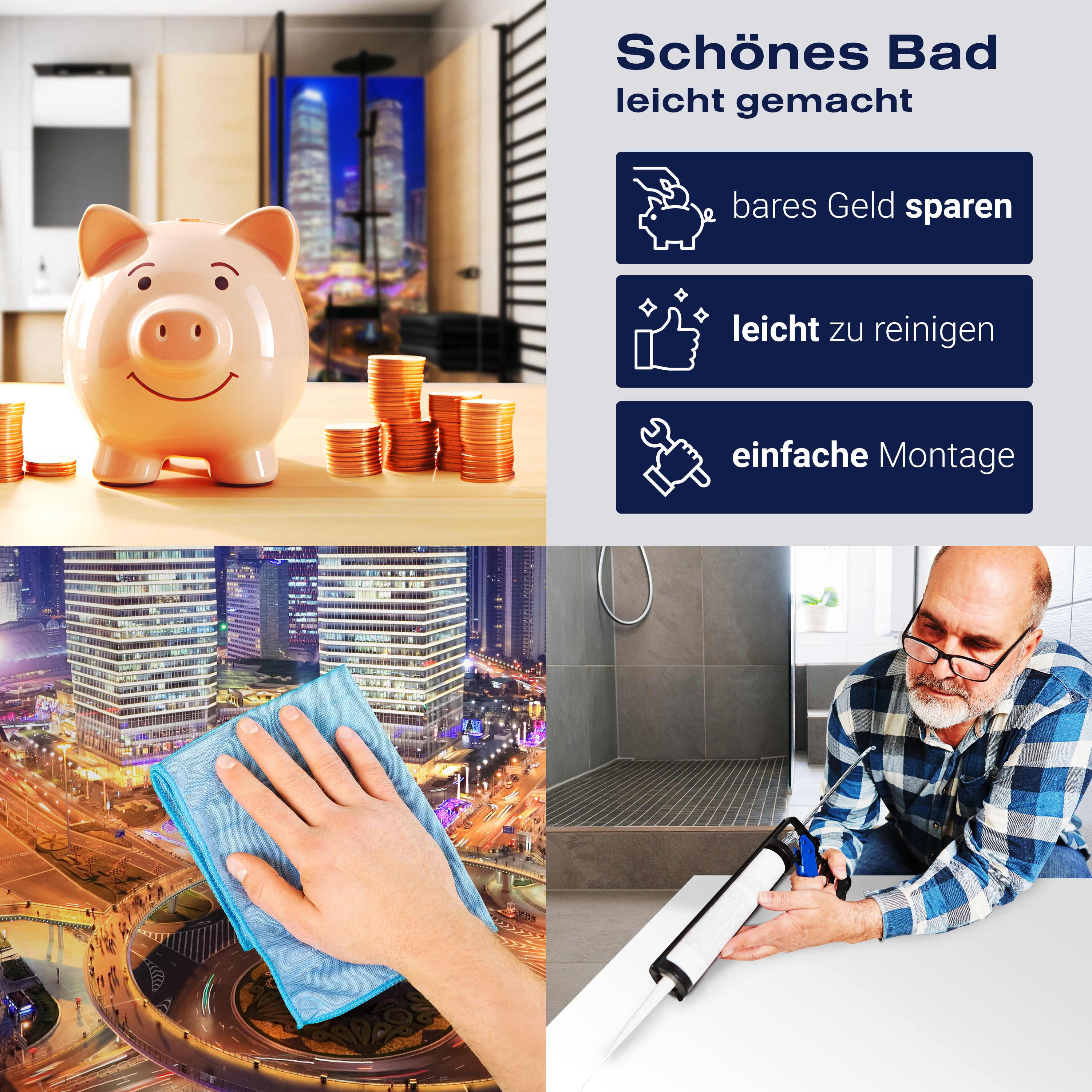 Die Reinigung Deiner Duschwand war noch nie so einfach. In einer Welt, in der Zeit ein kostbares Gut ist, verstehen wir, wie wichtig es ist, Reinigungsprozesse so effizient und mühelos wie möglich zu gestalten. Unsere Duschwände sind speziell dafür entworfen, Dein Leben leichter zu machen. Dank der glatten Oberfläche und der widerstandsfähigen Beschichtung lassen sich Spritzer und Flecken ohne großen Aufwand entfernen – ein schneller Wisch mit einem handelsüblichen Lappen, Spül- oder Wischtuch, und Deine Rückwand sieht aus wie neu.