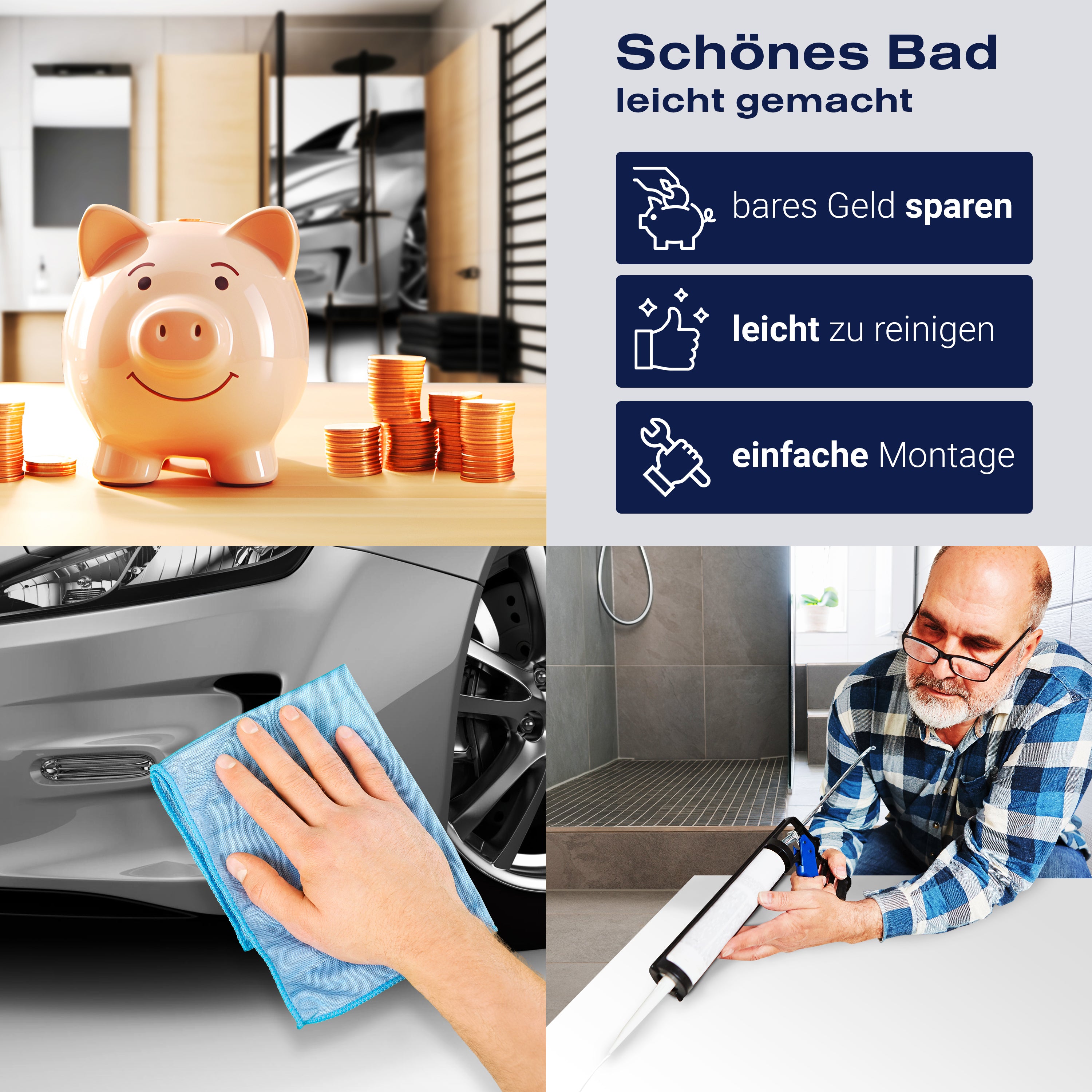 Die Reinigung Deiner Duschwand war noch nie so einfach. In einer Welt, in der Zeit ein kostbares Gut ist, verstehen wir, wie wichtig es ist, Reinigungsprozesse so effizient und mühelos wie möglich zu gestalten. Unsere Duschwände sind speziell dafür entworfen, Dein Leben leichter zu machen. Dank der glatten Oberfläche und der widerstandsfähigen Beschichtung lassen sich Spritzer und Flecken ohne großen Aufwand entfernen – ein schneller Wisch mit einem handelsüblichen Lappen, Spül- oder Wischtuch, und Deine Rückwand sieht aus wie neu.