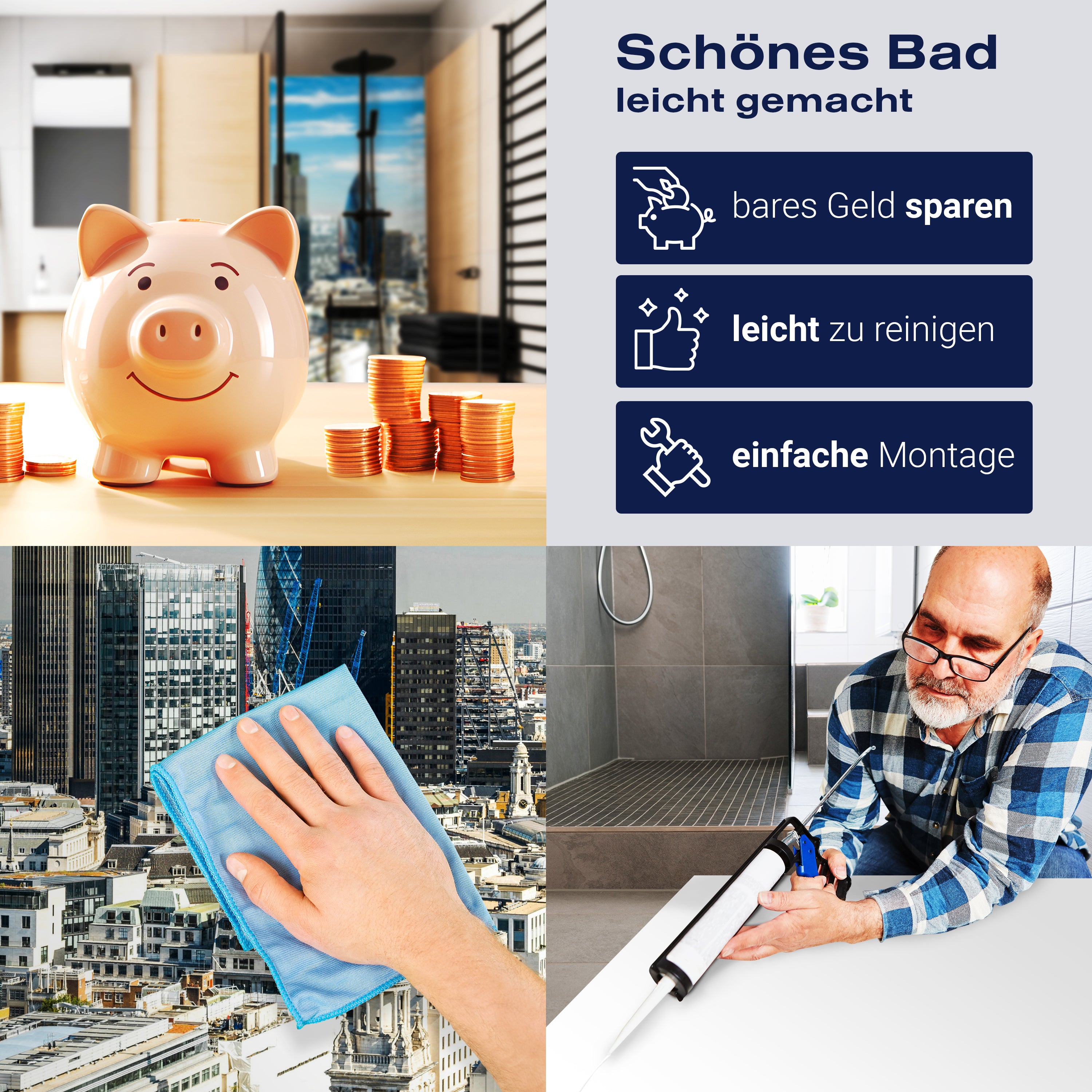 Die Reinigung Deiner Duschwand war noch nie so einfach. In einer Welt, in der Zeit ein kostbares Gut ist, verstehen wir, wie wichtig es ist, Reinigungsprozesse so effizient und mühelos wie möglich zu gestalten. Unsere Duschwände sind speziell dafür entworfen, Dein Leben leichter zu machen. Dank der glatten Oberfläche und der widerstandsfähigen Beschichtung lassen sich Spritzer und Flecken ohne großen Aufwand entfernen – ein schneller Wisch mit einem handelsüblichen Lappen, Spül- oder Wischtuch, und Deine Rückwand sieht aus wie neu.