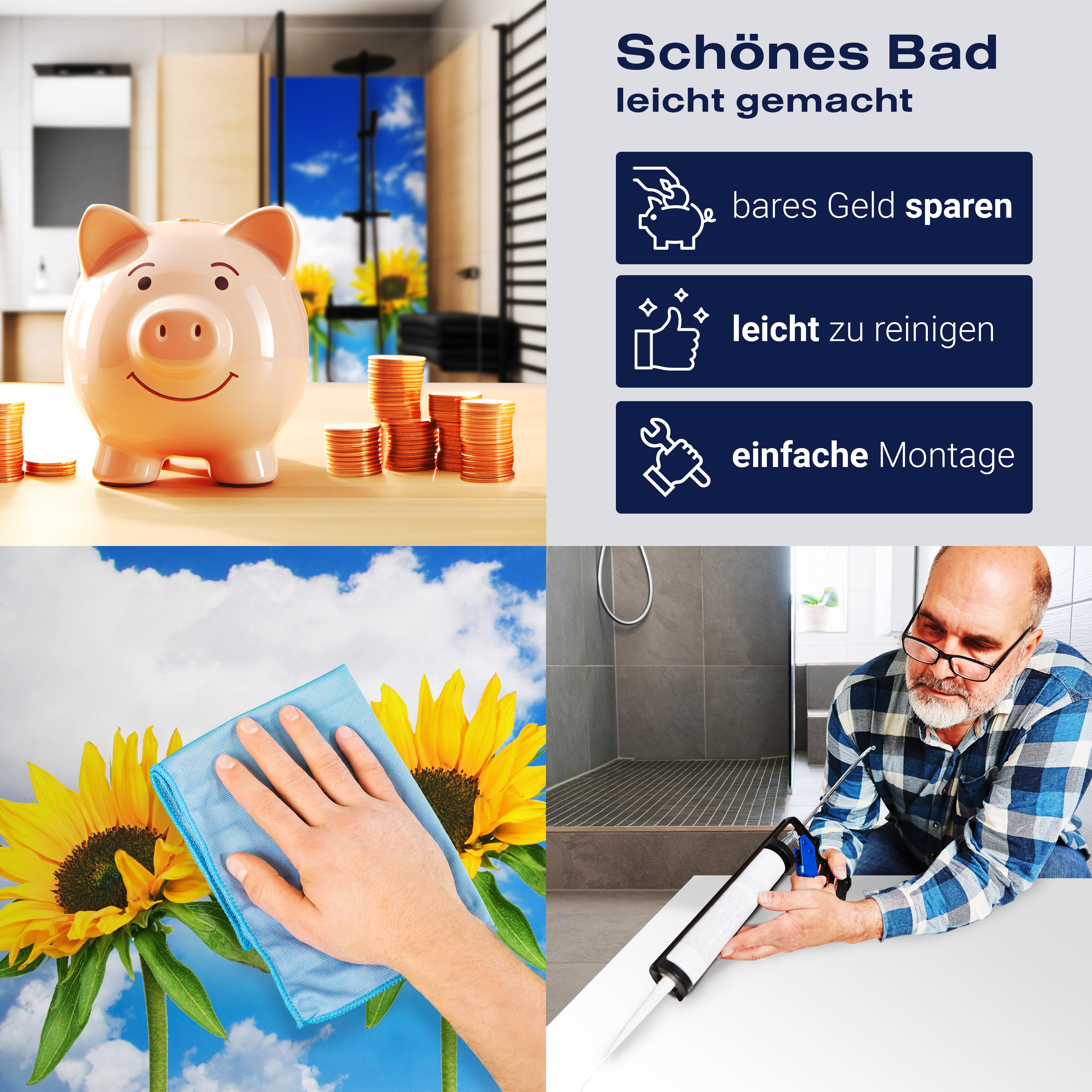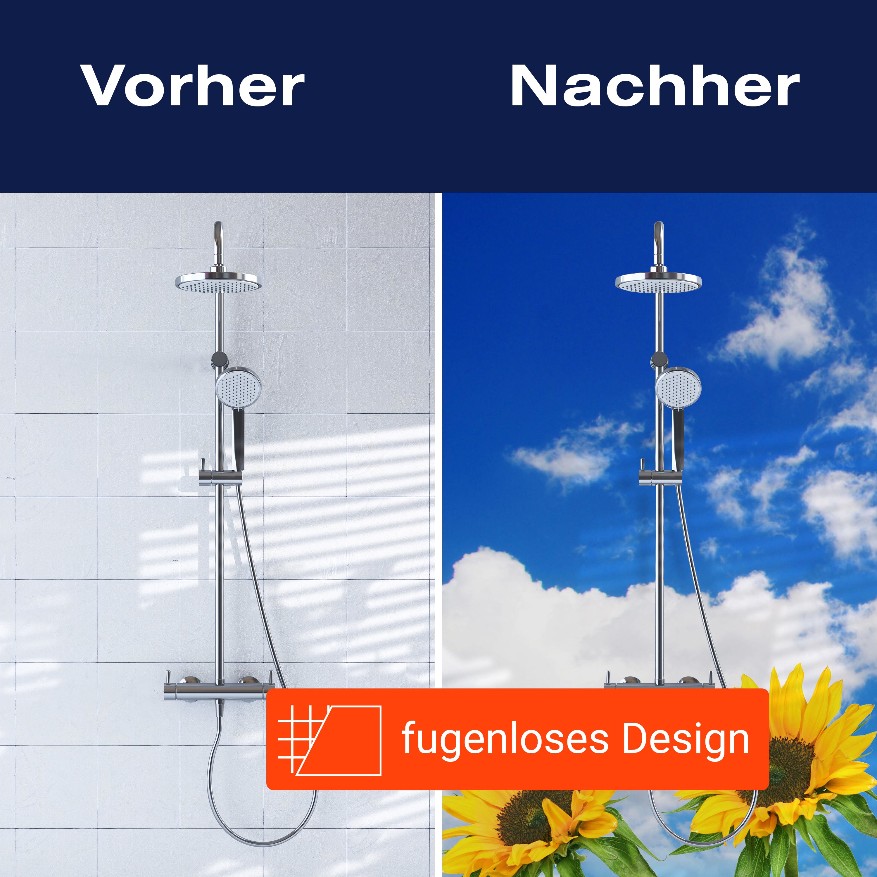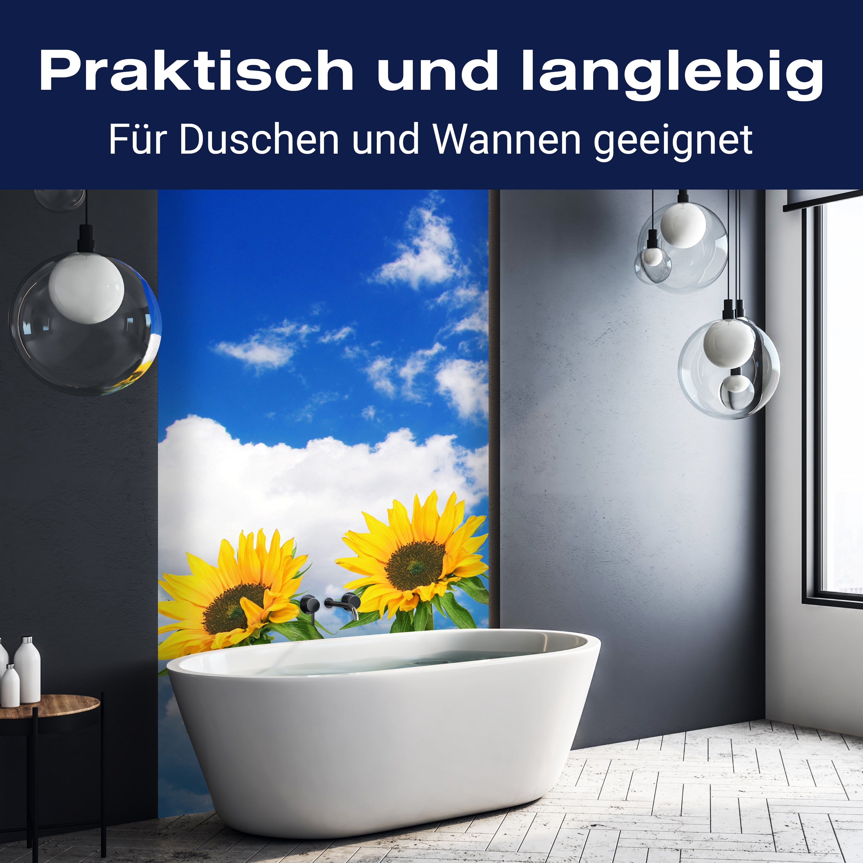 Bist du es leid, auf die langweiligen, schwer zu reinigende Fliesen in deiner Dusche zu schauen? Stell dir vor, wie dein Bad mit einer stilvollen, modernen Rückwand zum Leben erwacht! Unsere Duschwand 'Sonnenblumen' ist nicht nur ein optisches Highlight, sondern auch praktisch und pflegeleicht.