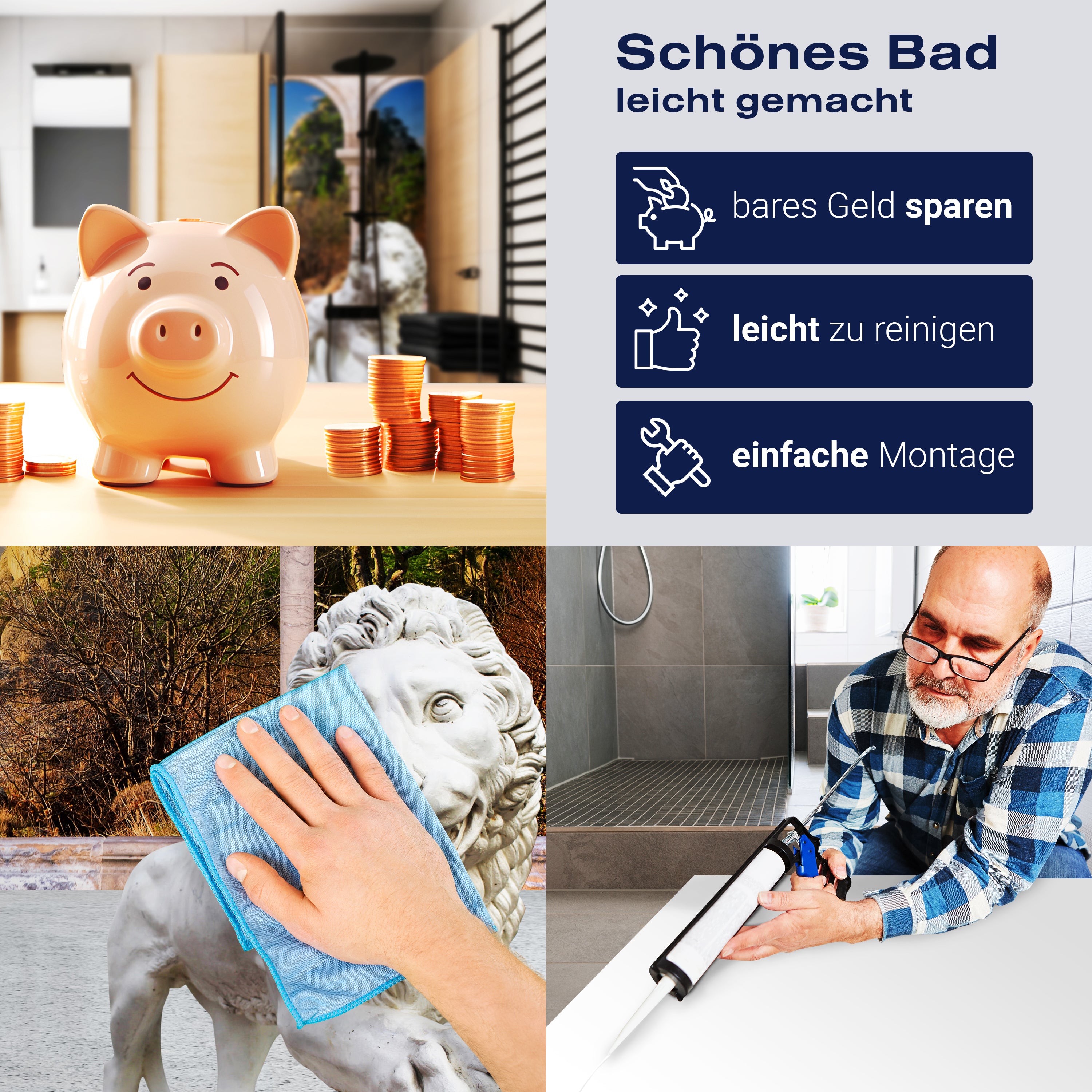 Die Reinigung Deiner Duschwand war noch nie so einfach. In einer Welt, in der Zeit ein kostbares Gut ist, verstehen wir, wie wichtig es ist, Reinigungsprozesse so effizient und mühelos wie möglich zu gestalten. Unsere Duschwände sind speziell dafür entworfen, Dein Leben leichter zu machen. Dank der glatten Oberfläche und der widerstandsfähigen Beschichtung lassen sich Spritzer und Flecken ohne großen Aufwand entfernen – ein schneller Wisch mit einem handelsüblichen Lappen, Spül- oder Wischtuch, und Deine Rückwand sieht aus wie neu.