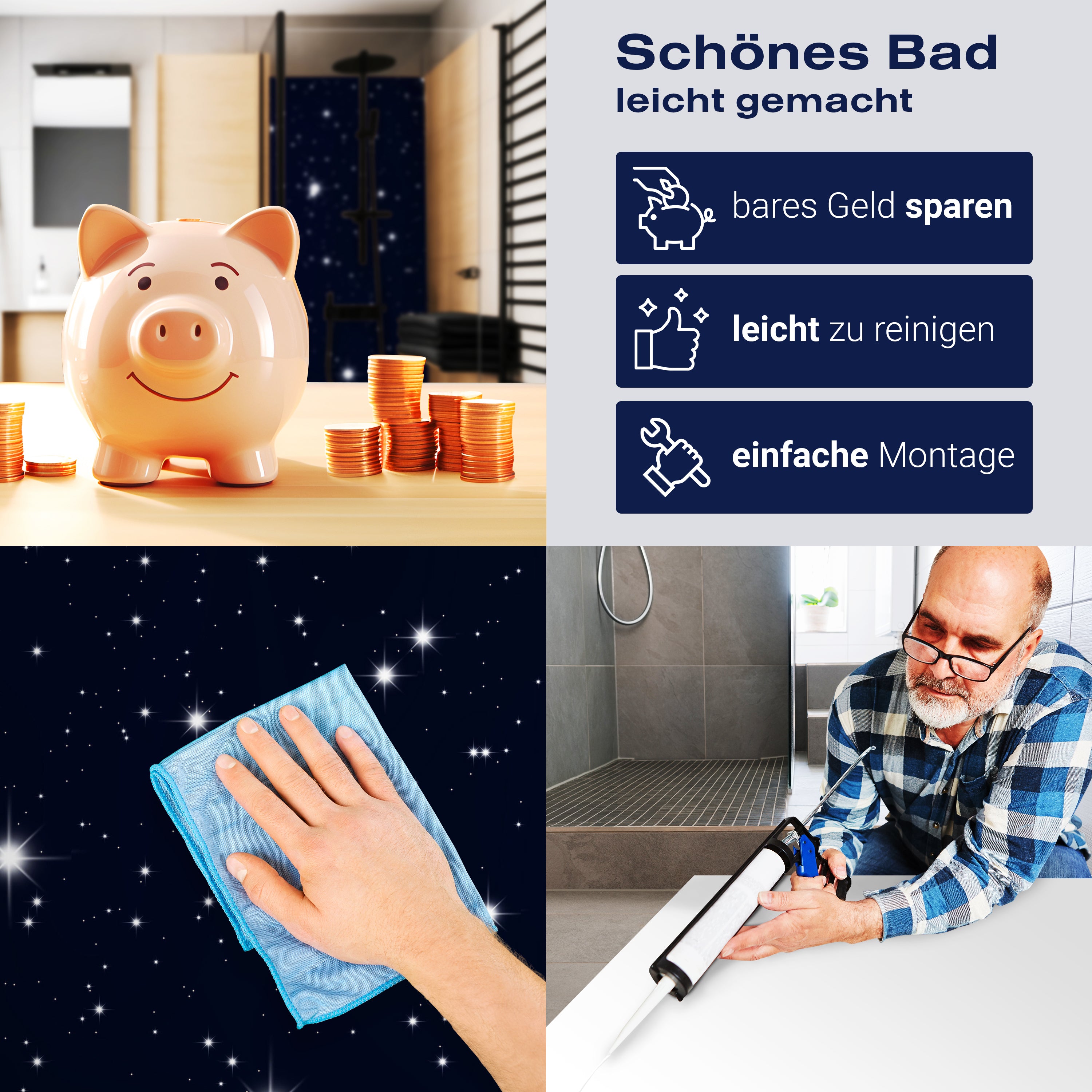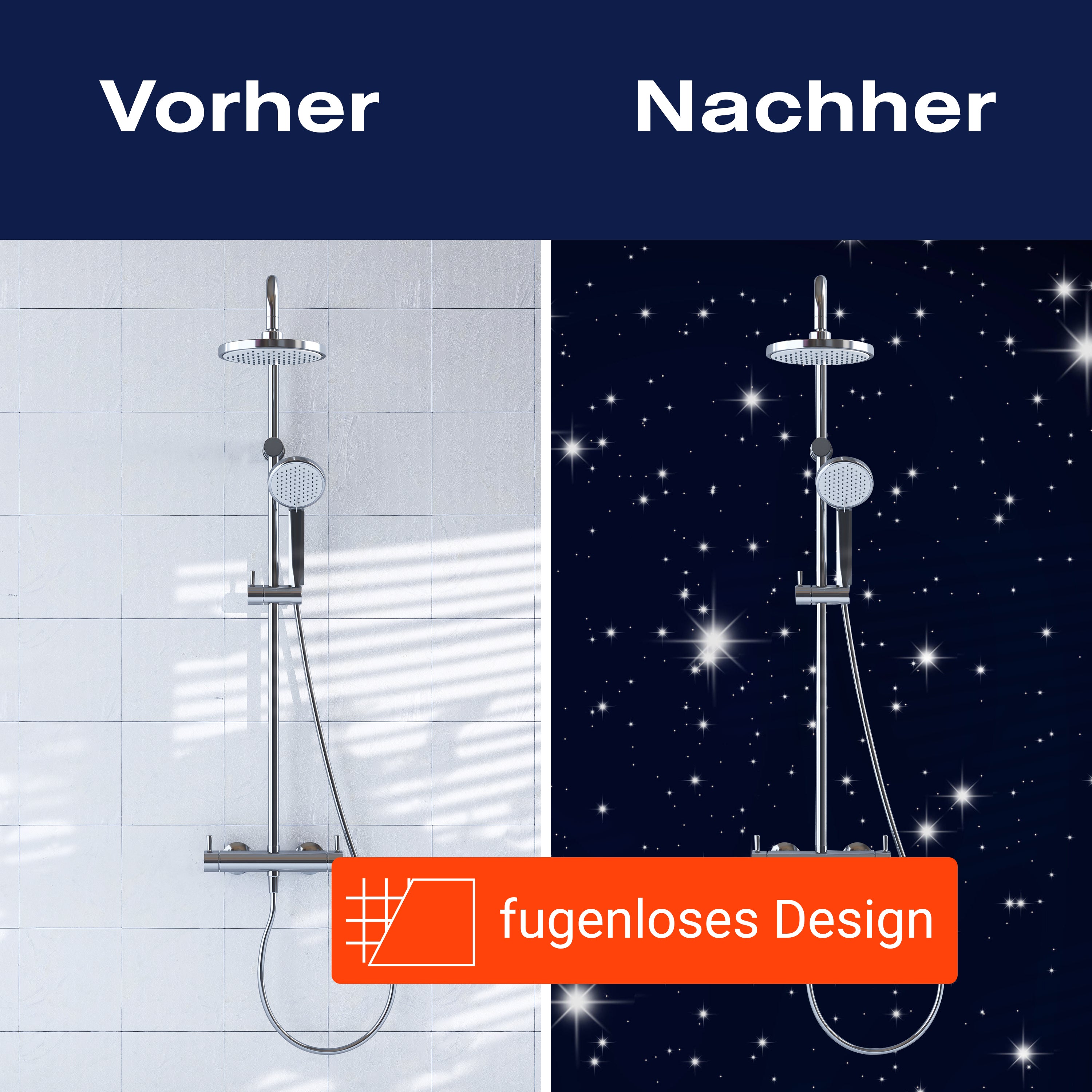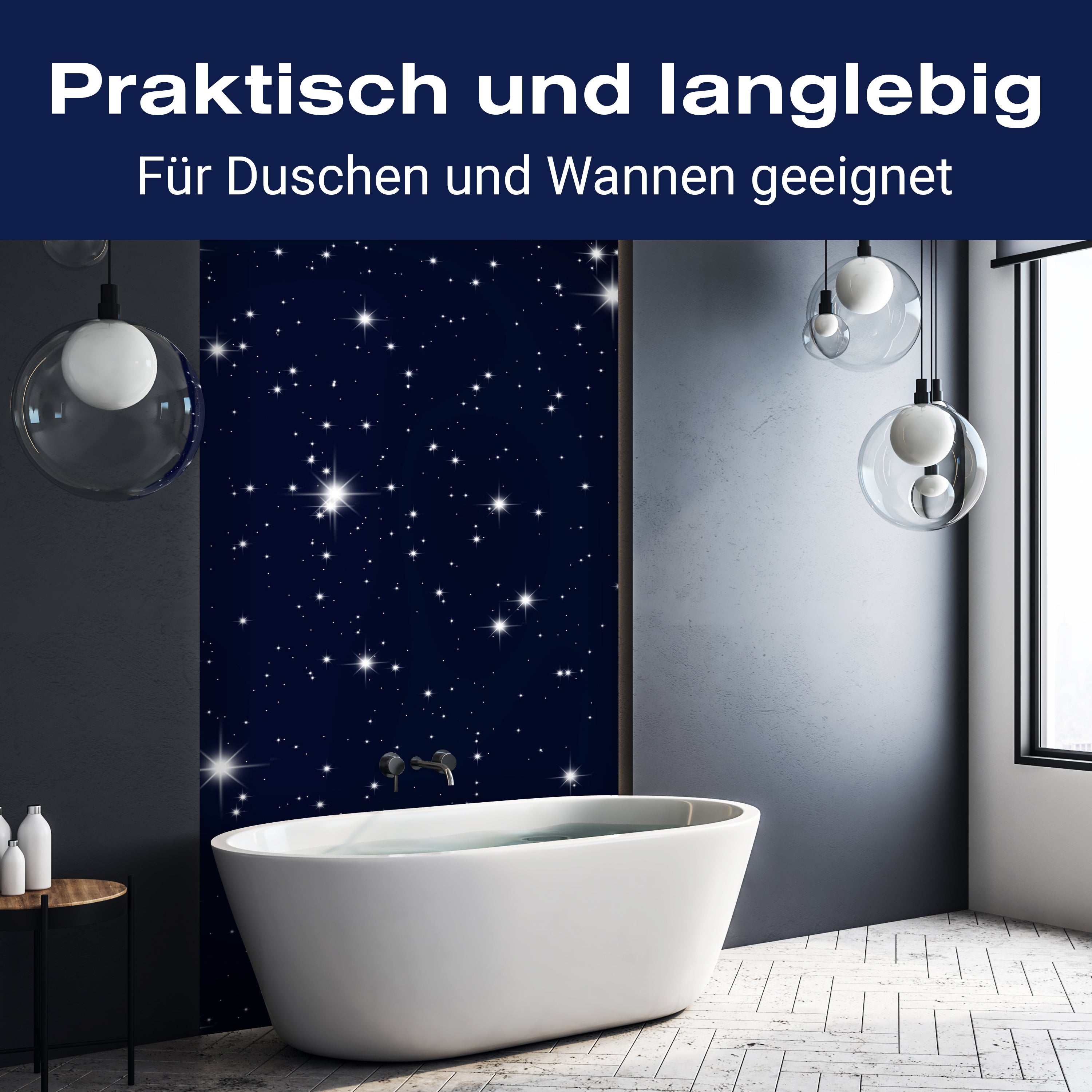 Bist du es leid, auf die langweiligen, schwer zu reinigende Fliesen in deiner Dusche zu schauen? Stell dir vor, wie dein Bad mit einer stilvollen, modernen Rückwand zum Leben erwacht! Unsere Duschwand 'Sternenhimmel' ist nicht nur ein optisches Highlight, sondern auch praktisch und pflegeleicht.