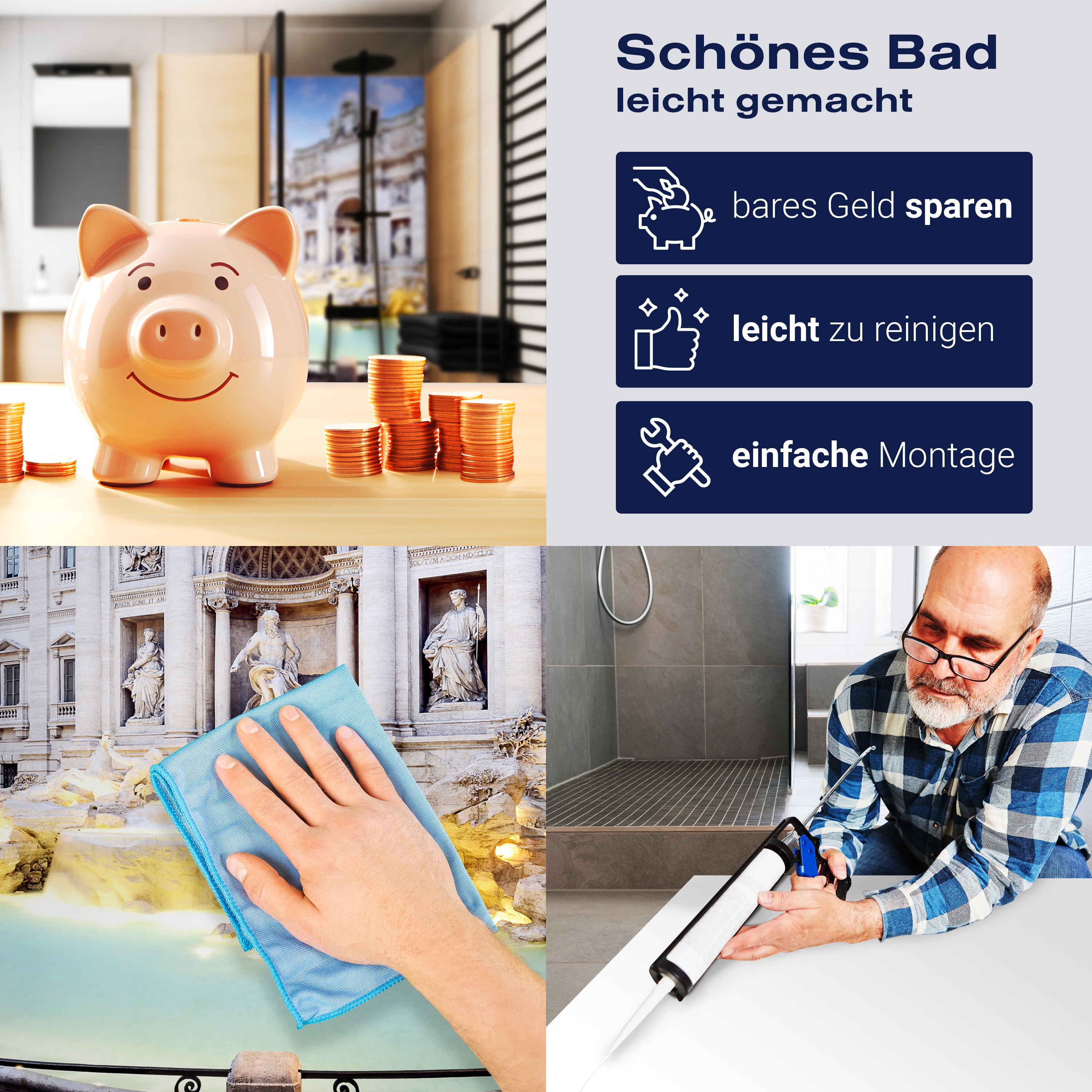 Bist du es leid, auf die langweiligen, schwer zu reinigende Fliesen in deiner Dusche zu schauen? Stell dir vor, wie dein Bad mit einer stilvollen, modernen Rückwand zum Leben erwacht! Unsere Duschwand 'Trevi-Brunnen, Rom' ist nicht nur ein optisches Highlight, sondern auch praktisch und pflegeleicht.