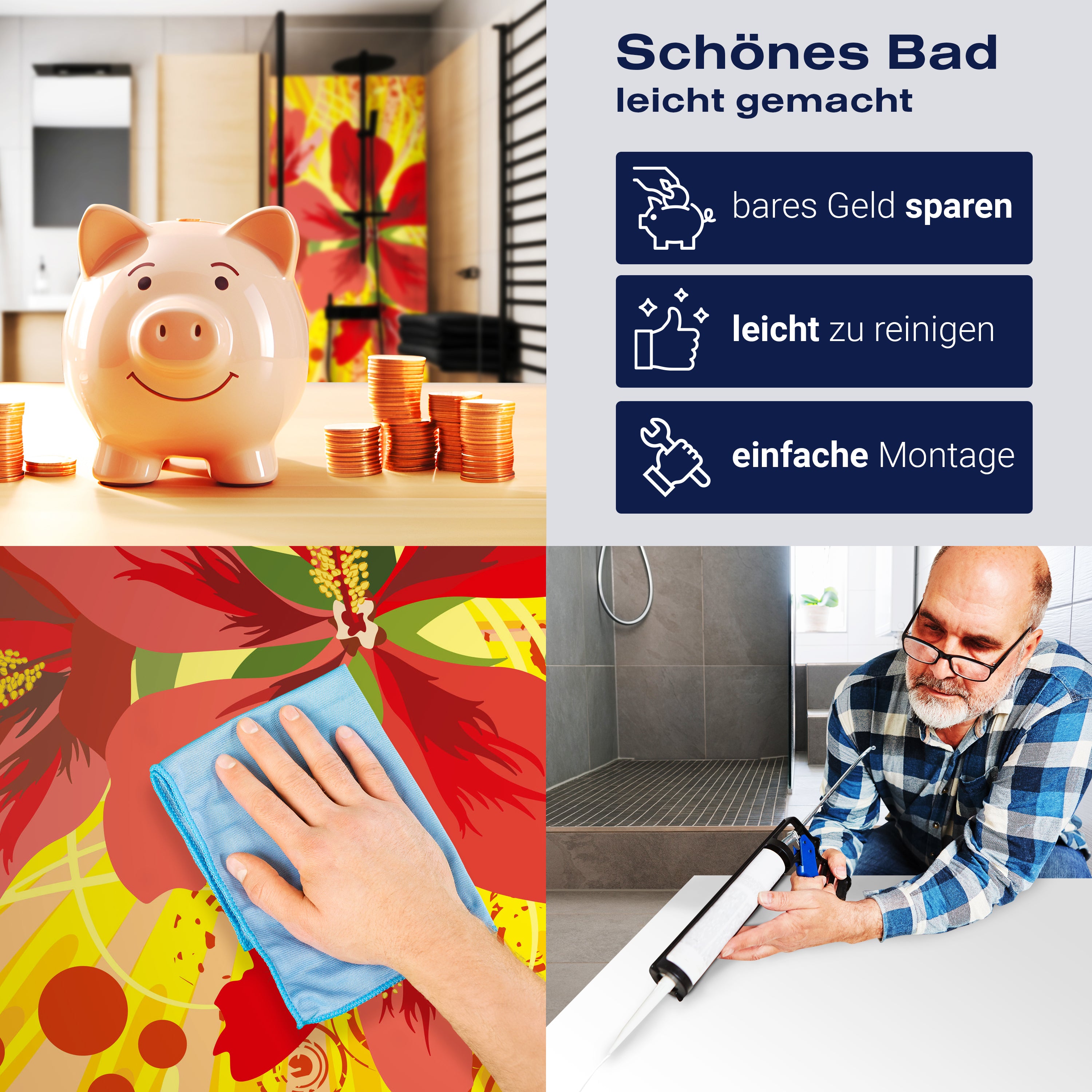 Die Reinigung Deiner Duschwand war noch nie so einfach. In einer Welt, in der Zeit ein kostbares Gut ist, verstehen wir, wie wichtig es ist, Reinigungsprozesse so effizient und mühelos wie möglich zu gestalten. Unsere Duschwände sind speziell dafür entworfen, Dein Leben leichter zu machen. Dank der glatten Oberfläche und der widerstandsfähigen Beschichtung lassen sich Spritzer und Flecken ohne großen Aufwand entfernen – ein schneller Wisch mit einem handelsüblichen Lappen, Spül- oder Wischtuch, und Deine Rückwand sieht aus wie neu.