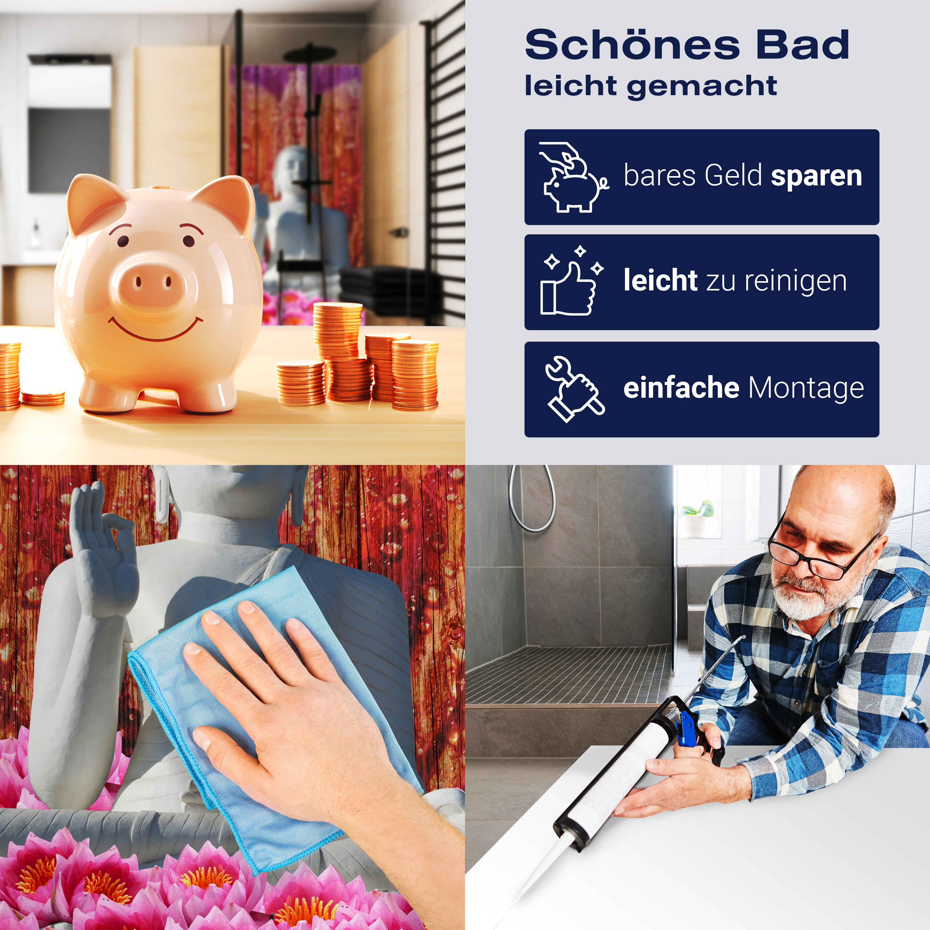 Vergiss die Tage, an denen Spritzer und Flecken deine Dusche ruiniert haben. Mit der Duschrückwand 'Weiß Sitzende Buddha-Statue' gehören solche Sorgen der Vergangenheit an. Das hochwertige Material sorgt dafür, dass deine Dusche gegen Wasser und andere alltägliche Missgeschicke resistent ist. Ein einfacher Wisch, und sie sieht aus wie neu – ohne den Einsatz von aggressiven Reinigungsmitteln.