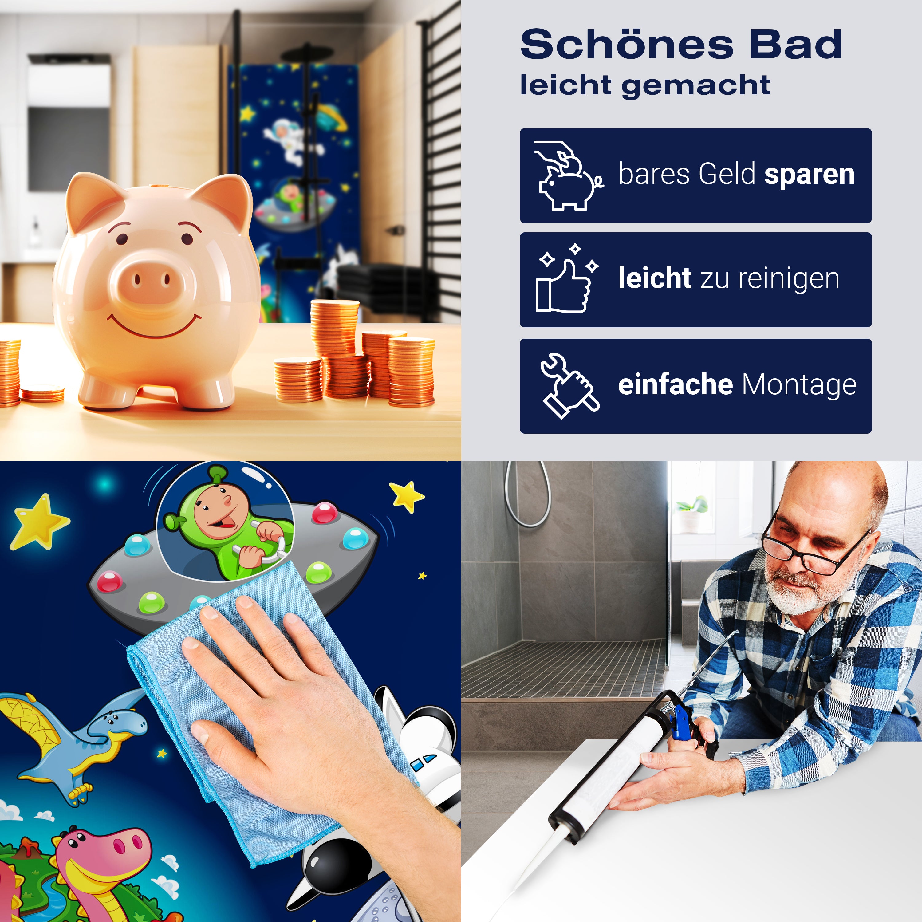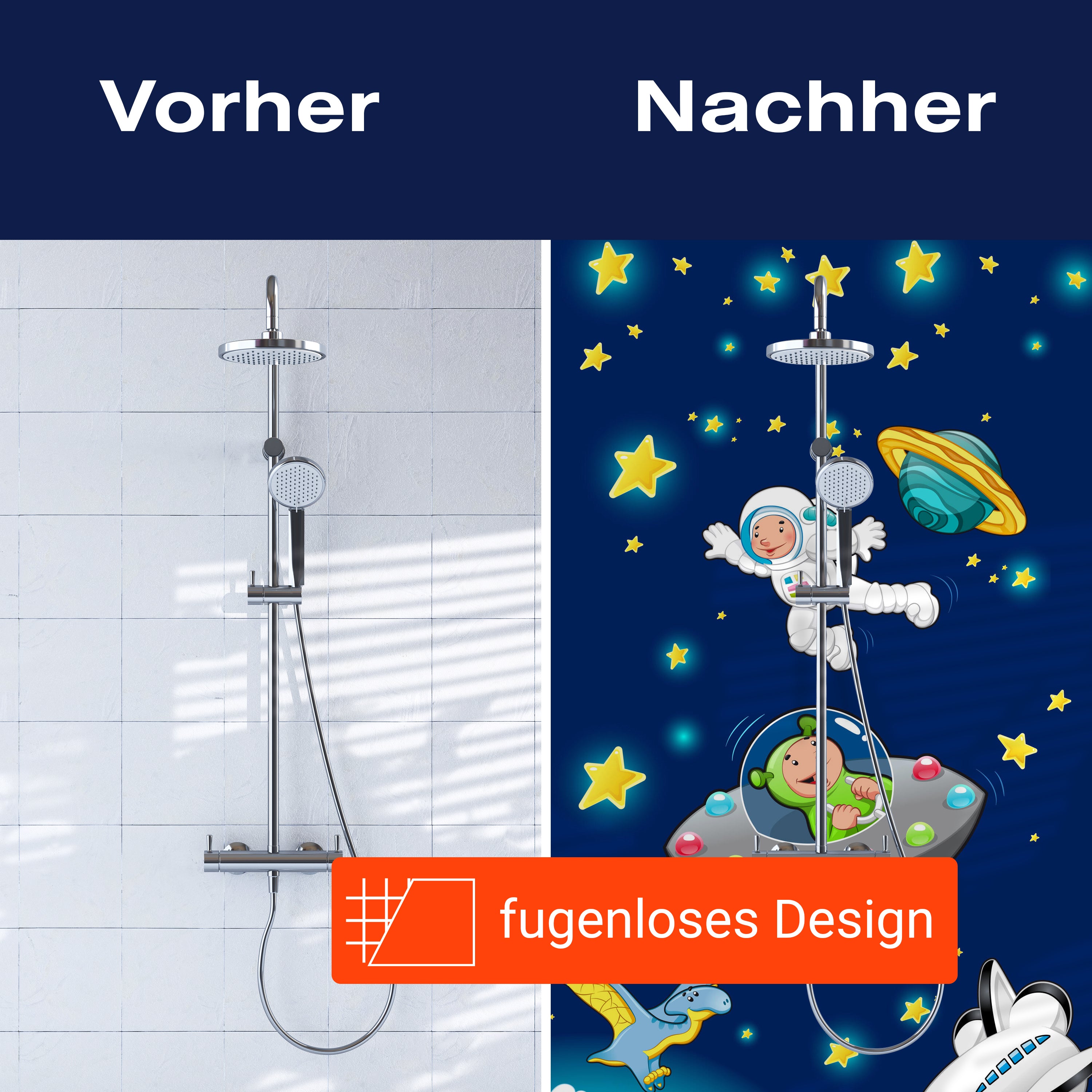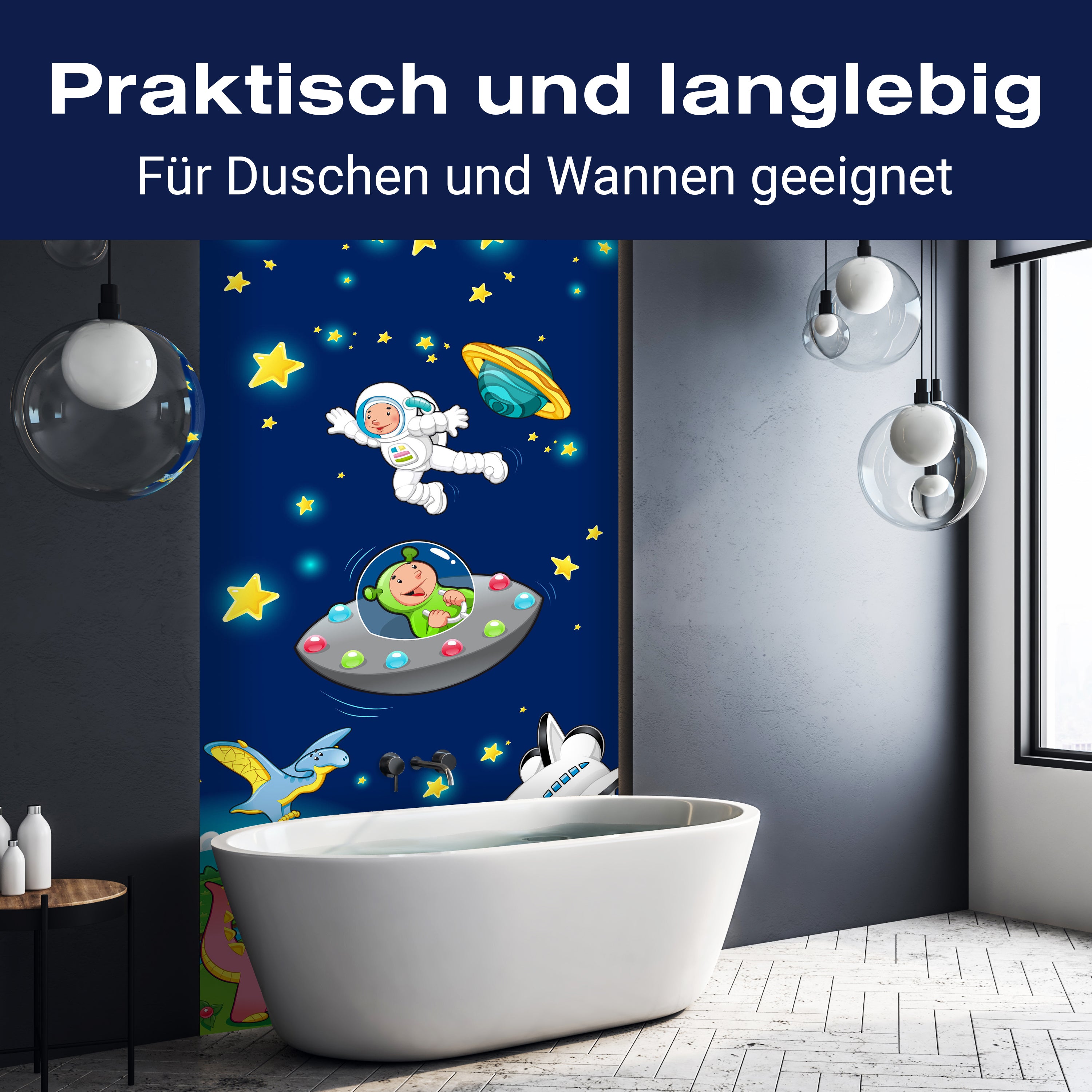 Bist du es leid, auf die langweiligen, schwer zu reinigende Fliesen in deiner Dusche zu schauen? Stell dir vor, wie dein Bad mit einer stilvollen, modernen Rückwand zum Leben erwacht! Unsere Duschwand 'Weltall' ist nicht nur ein optisches Highlight, sondern auch praktisch und pflegeleicht.