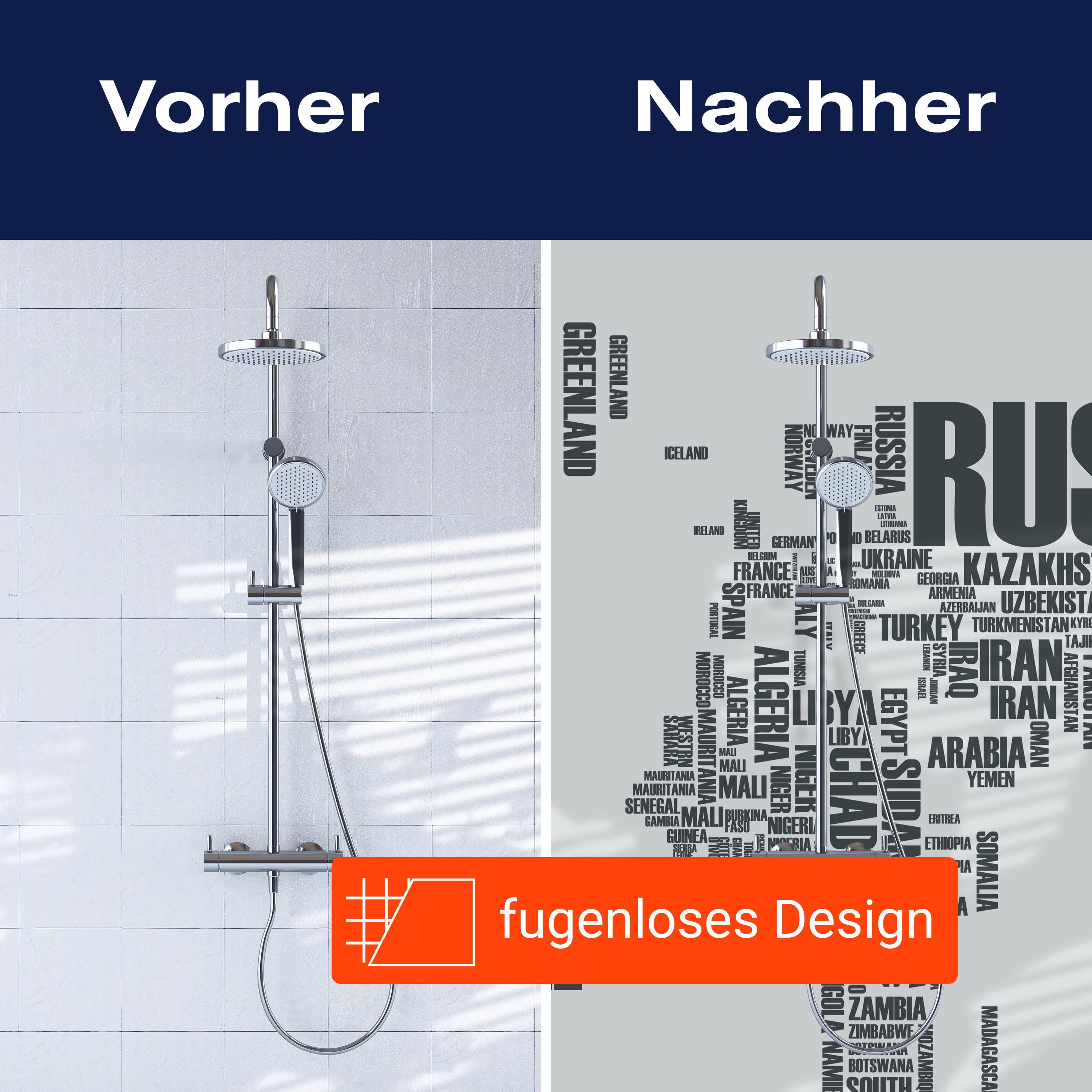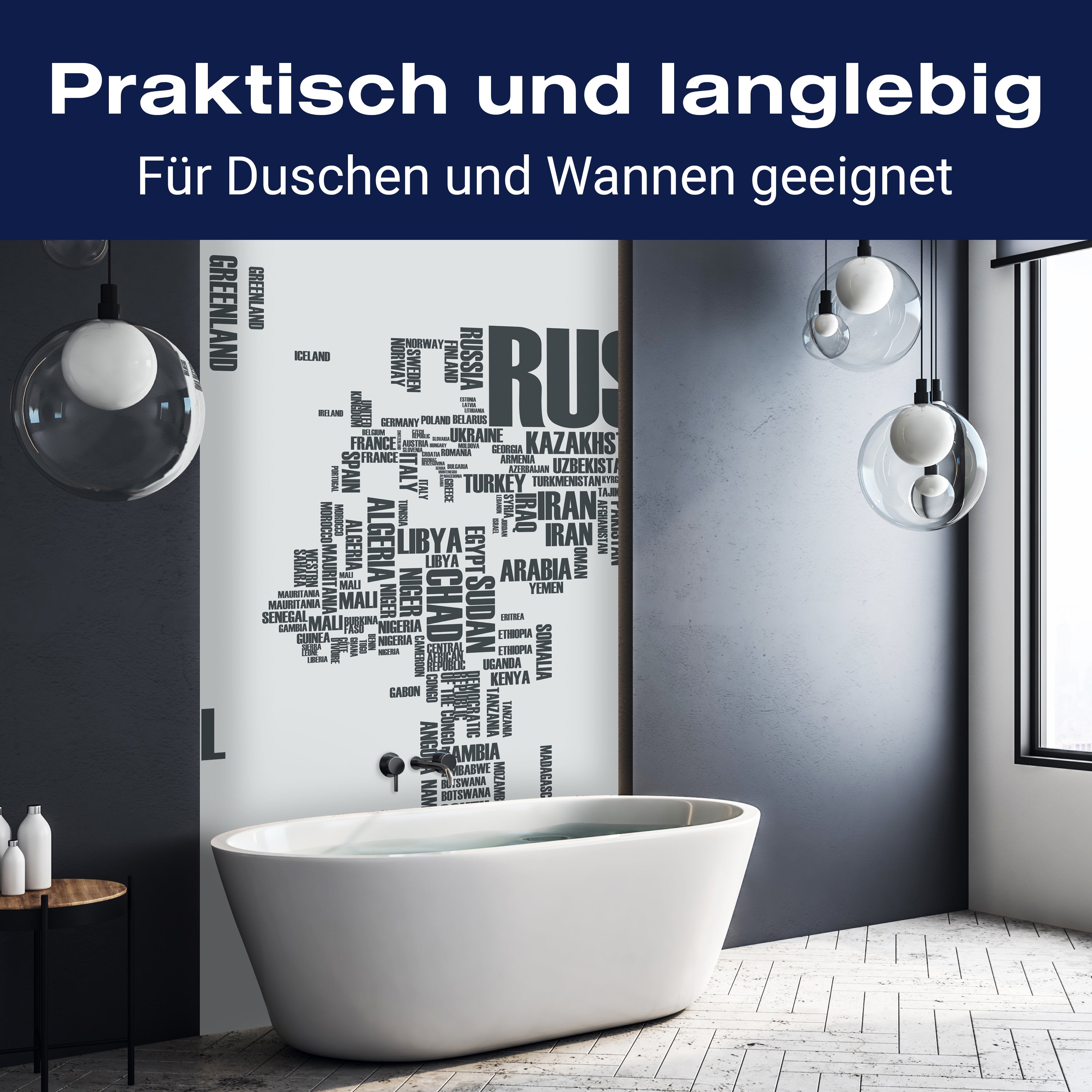 Bist du es leid, auf die langweiligen, schwer zu reinigende Fliesen in deiner Dusche zu schauen? Stell dir vor, wie dein Bad mit einer stilvollen, modernen Rückwand zum Leben erwacht! Unsere Duschwand 'Weltkarte Landnamen Erde' ist nicht nur ein optisches Highlight, sondern auch praktisch und pflegeleicht.