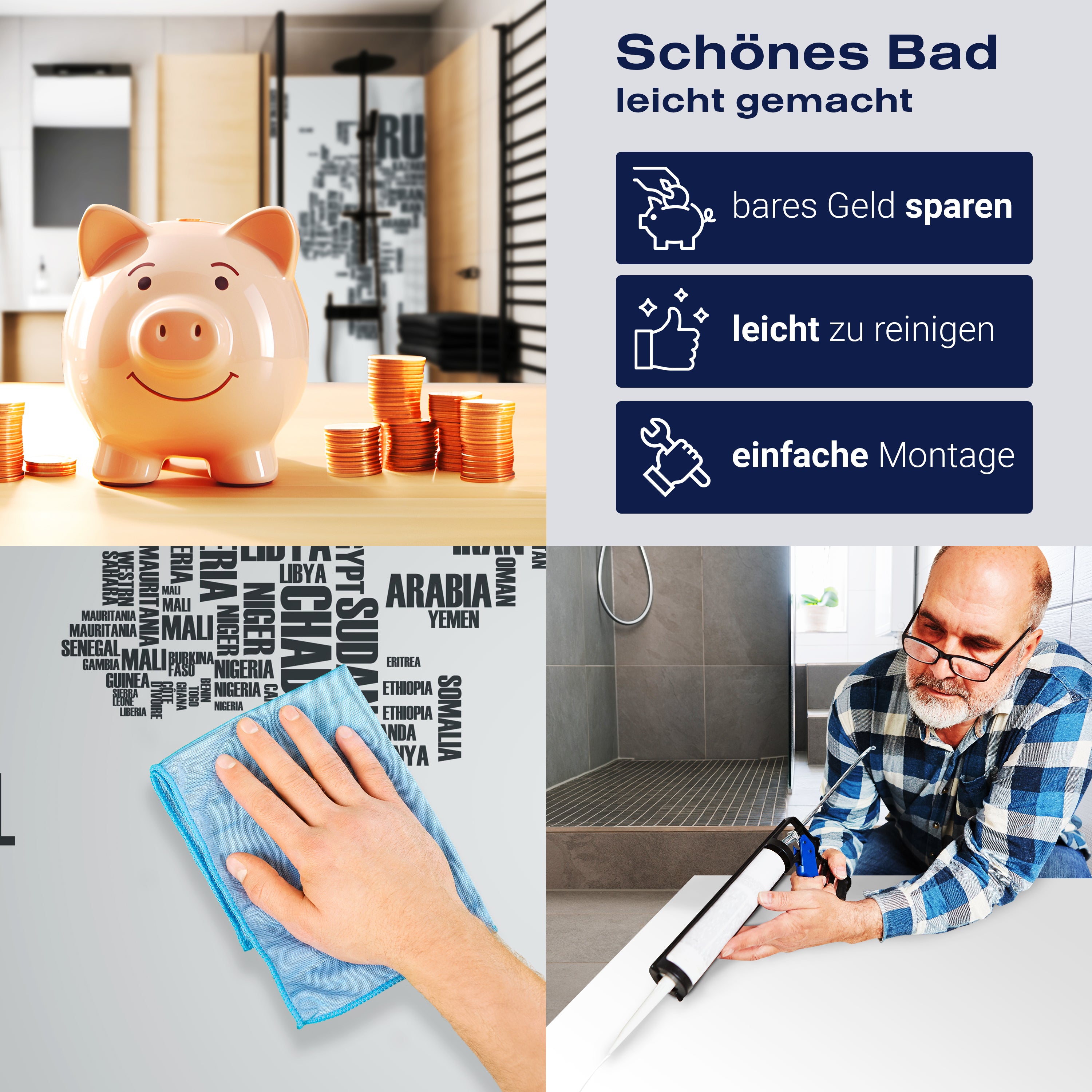 Die Reinigung Deiner Duschwand war noch nie so einfach. In einer Welt, in der Zeit ein kostbares Gut ist, verstehen wir, wie wichtig es ist, Reinigungsprozesse so effizient und mühelos wie möglich zu gestalten. Unsere Duschwände sind speziell dafür entworfen, Dein Leben leichter zu machen. Dank der glatten Oberfläche und der widerstandsfähigen Beschichtung lassen sich Spritzer und Flecken ohne großen Aufwand entfernen – ein schneller Wisch mit einem handelsüblichen Lappen, Spül- oder Wischtuch, und Deine Rückwand sieht aus wie neu.