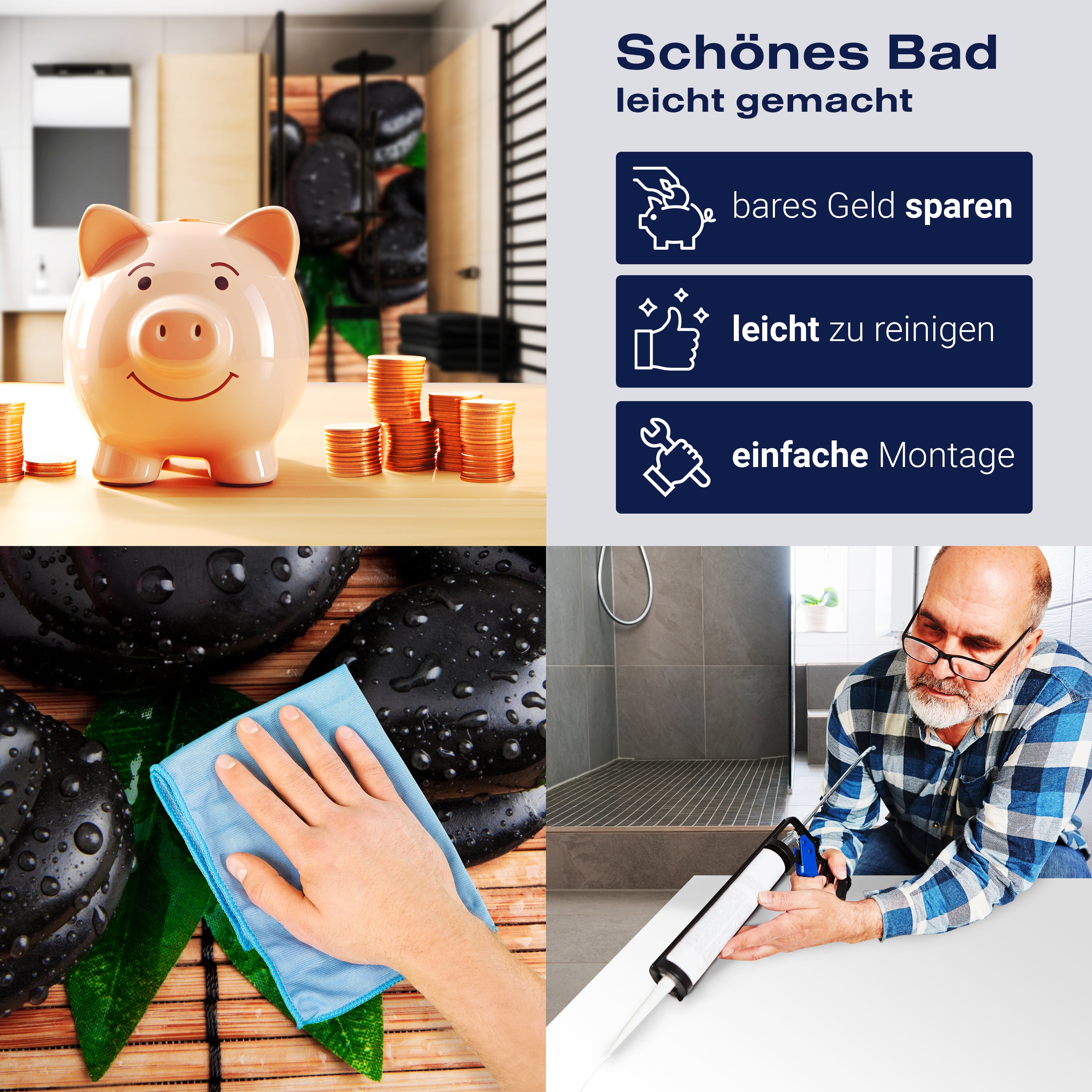 Die Reinigung Deiner Duschwand war noch nie so einfach. In einer Welt, in der Zeit ein kostbares Gut ist, verstehen wir, wie wichtig es ist, Reinigungsprozesse so effizient und mühelos wie möglich zu gestalten. Unsere Duschwände sind speziell dafür entworfen, Dein Leben leichter zu machen. Dank der glatten Oberfläche und der widerstandsfähigen Beschichtung lassen sich Spritzer und Flecken ohne großen Aufwand entfernen – ein schneller Wisch mit einem handelsüblichen Lappen, Spül- oder Wischtuch, und Deine Rückwand sieht aus wie neu.