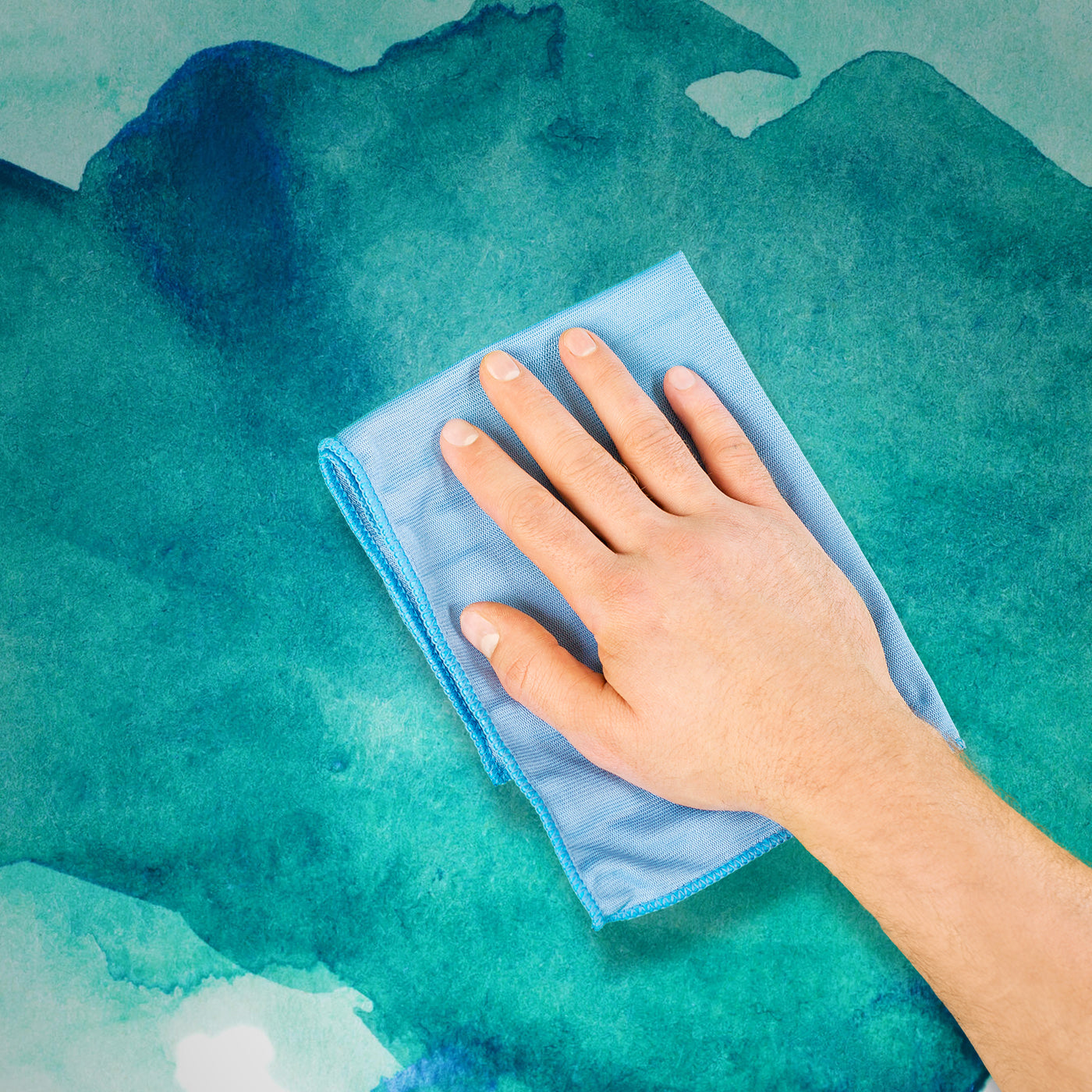 - Reinige eventuelle Verschmutzungen oder Kleberreste sofort mit einem feuchten Schwamm oder Tuch.