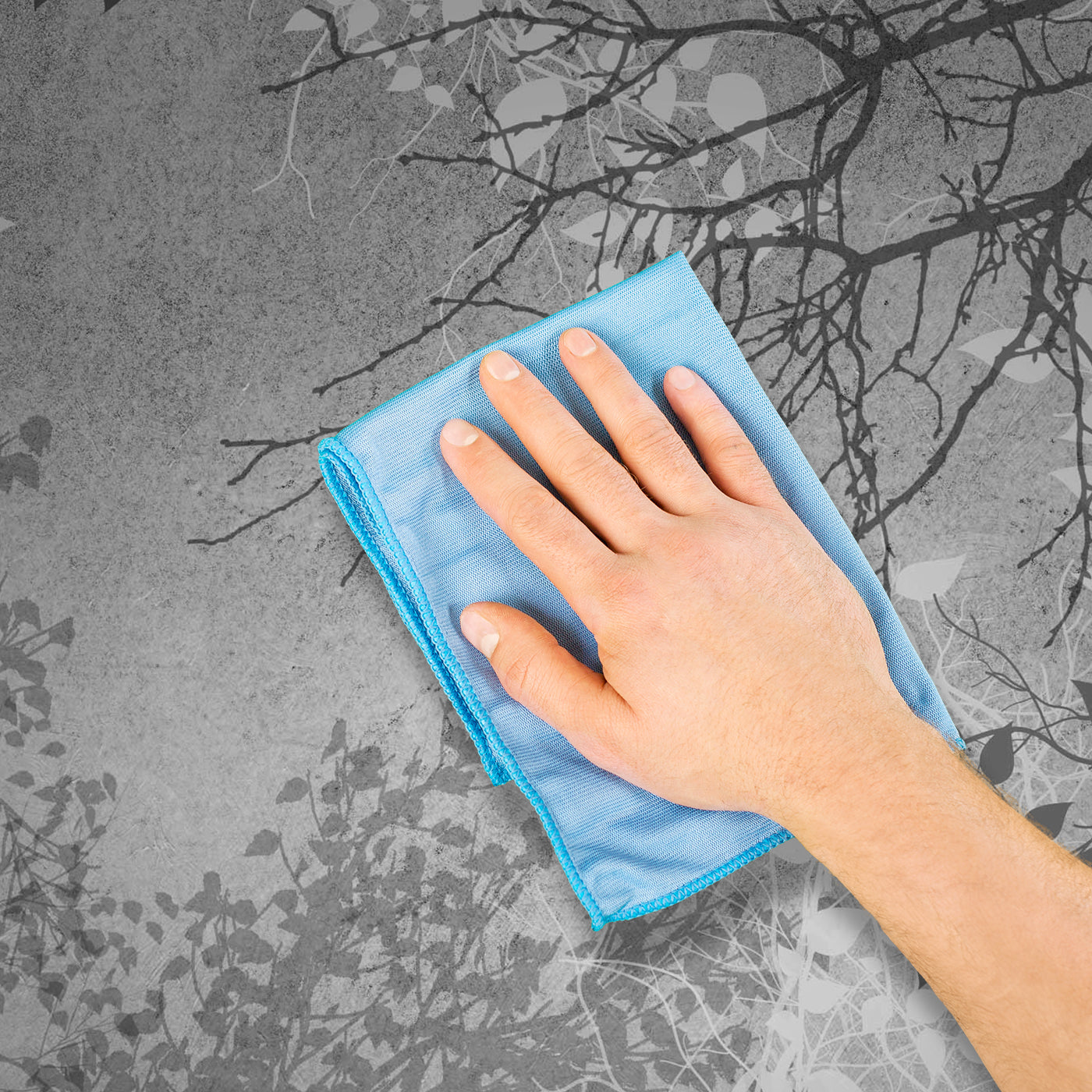 - Reinige eventuelle Verschmutzungen oder Kleberreste sofort mit einem feuchten Schwamm oder Tuch.