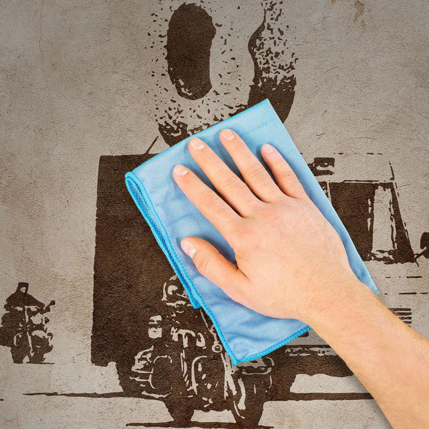 - Reinige eventuelle Verschmutzungen oder Kleberreste sofort mit einem feuchten Schwamm oder Tuch.