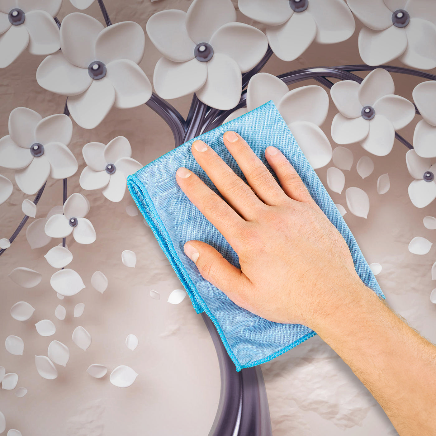 - Reinige eventuelle Verschmutzungen oder Kleberreste sofort mit einem feuchten Schwamm oder Tuch.