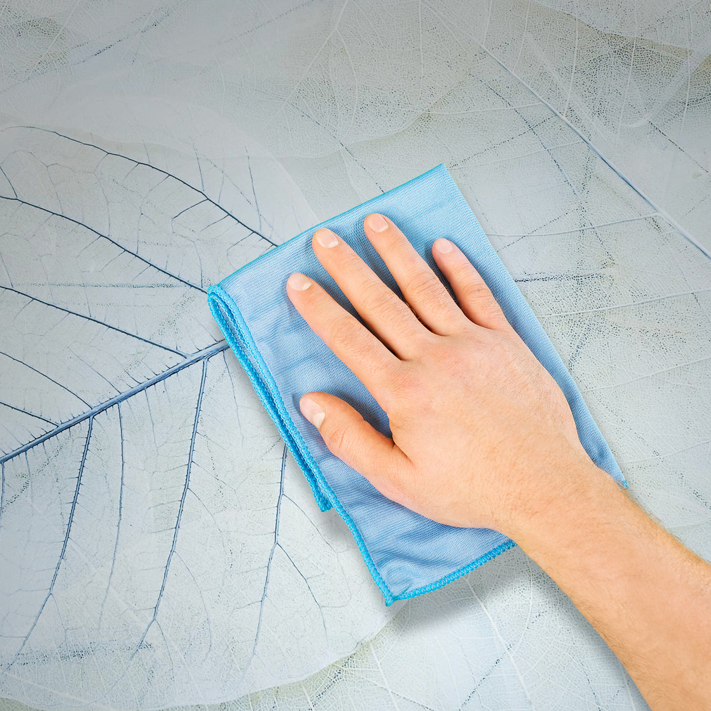 - Reinige eventuelle Verschmutzungen oder Kleberreste sofort mit einem feuchten Schwamm oder Tuch.
