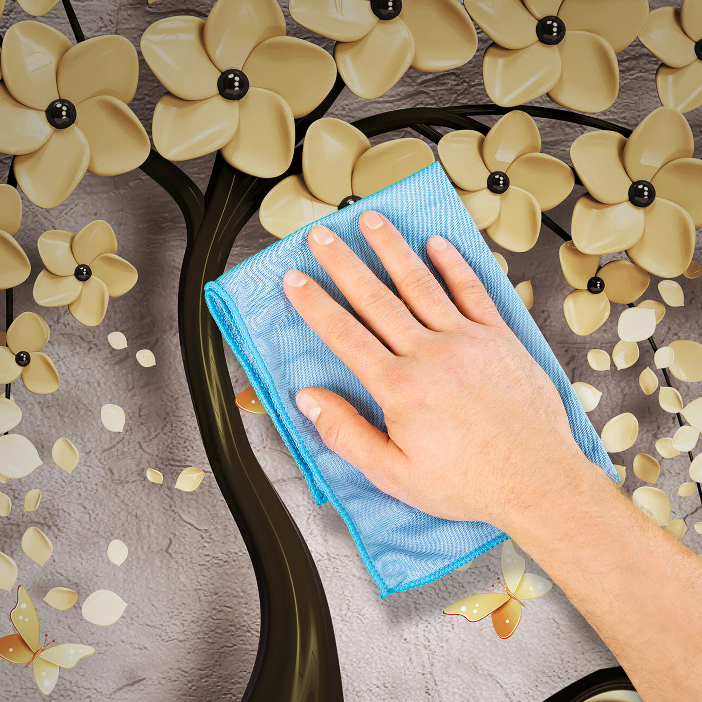- Reinige eventuelle Verschmutzungen oder Kleberreste sofort mit einem feuchten Schwamm oder Tuch.