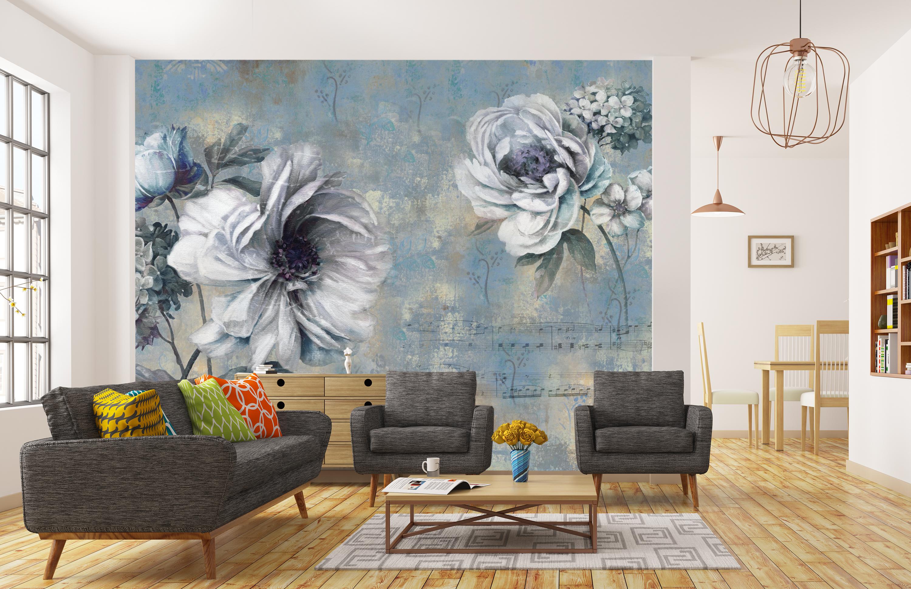 FOTOTAPETE Blumen alt blau Betonwand Musiknoten