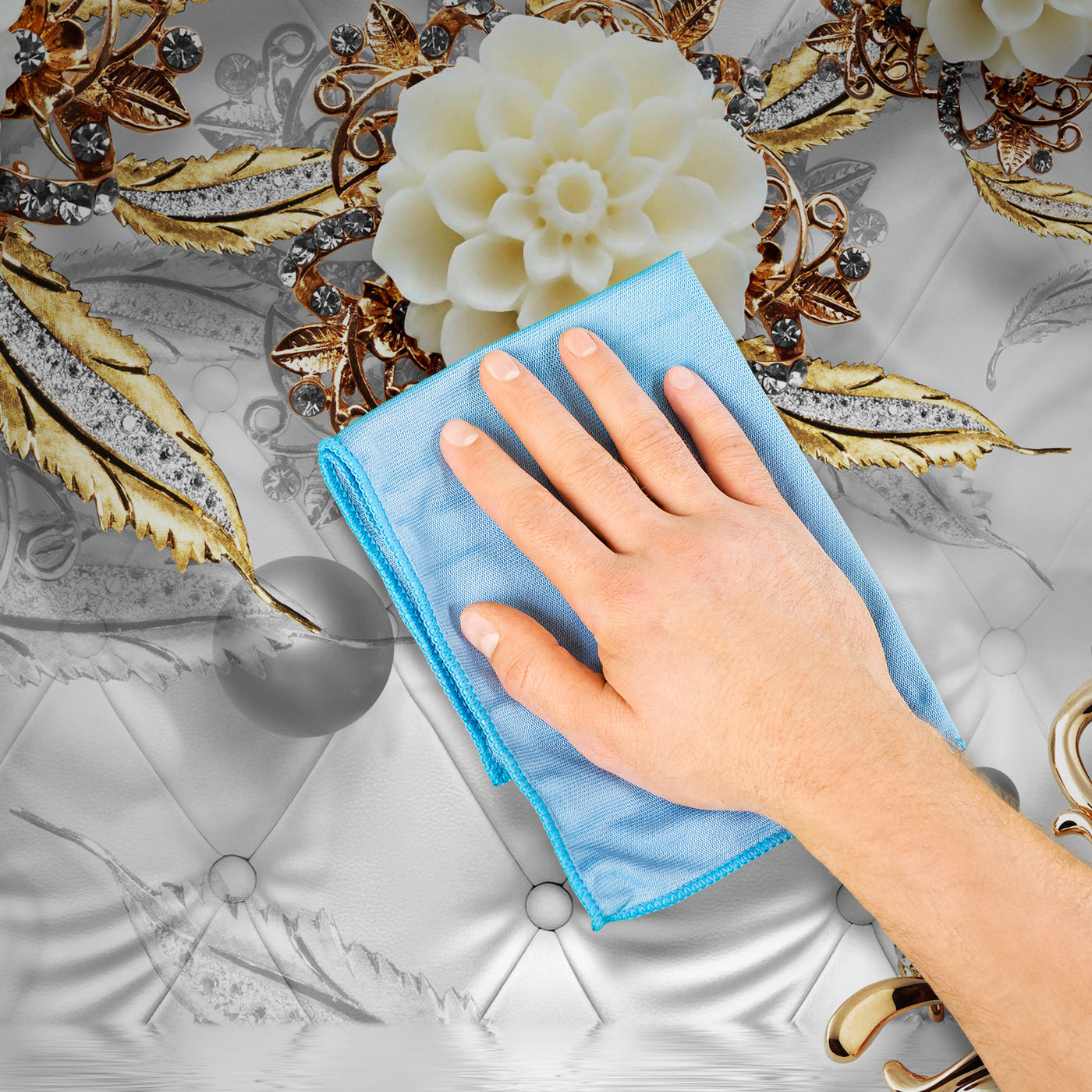 - Reinige eventuelle Verschmutzungen oder Kleberreste sofort mit einem feuchten Schwamm oder Tuch.