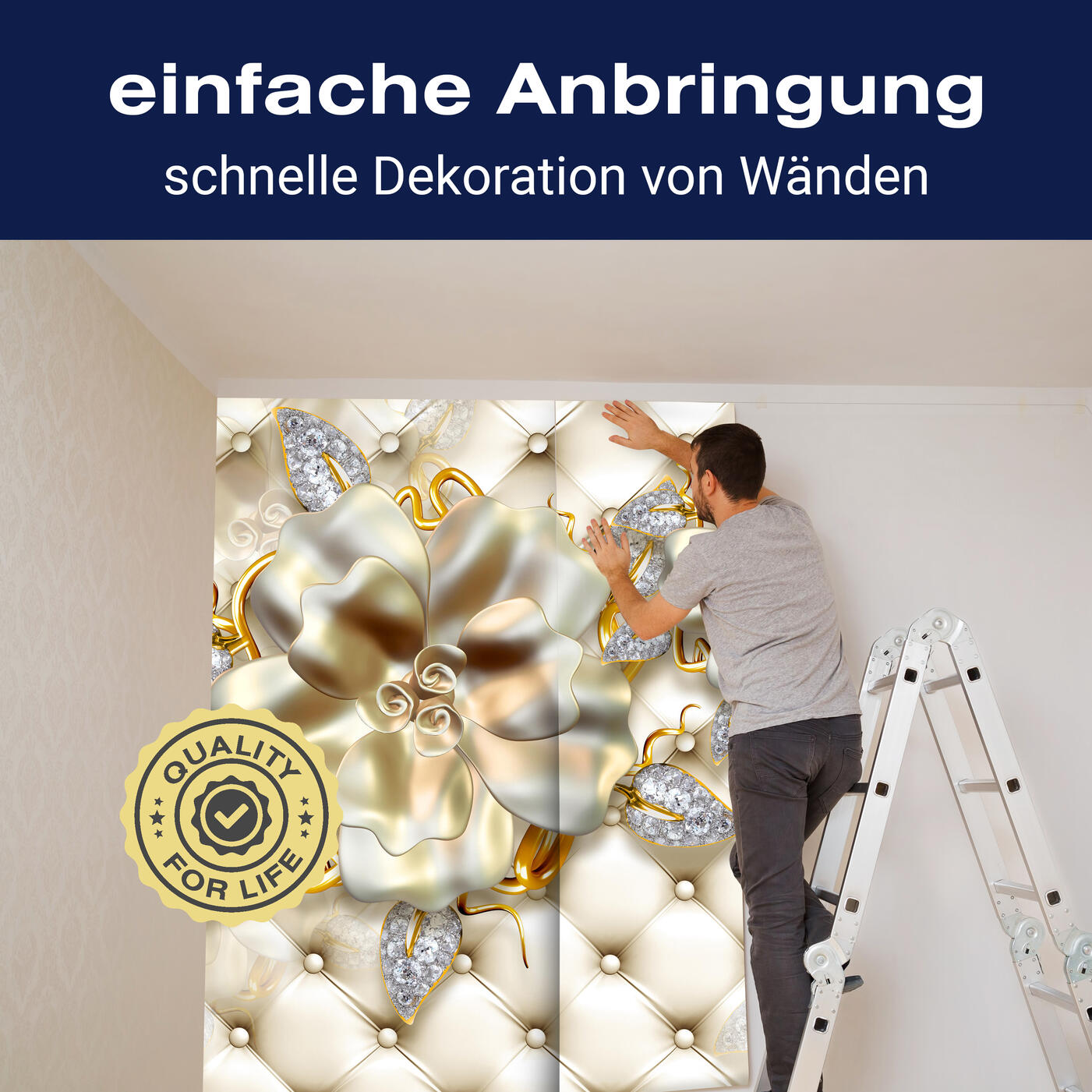 Träumst Du davon, Deine Wände in eine beeindruckende Kunstgalerie zu verwandeln? Mit unserer hochwertigen Fototapete Blumen Gold Polster 3D M6089 ist es jetzt möglich! Jede Wand wird zu einer Leinwand Deiner Kreativität.