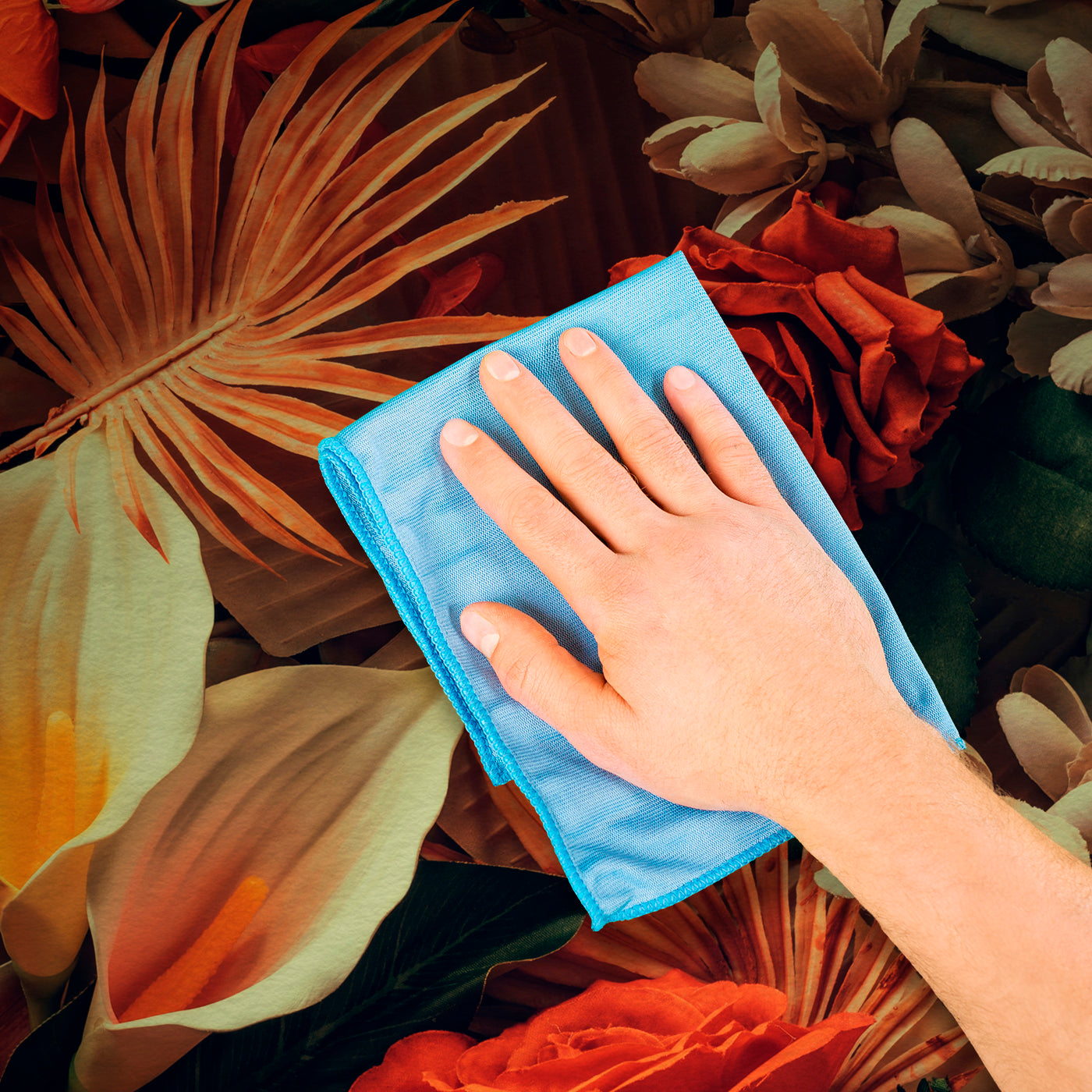 - Reinige eventuelle Verschmutzungen oder Kleberreste sofort mit einem feuchten Schwamm oder Tuch.