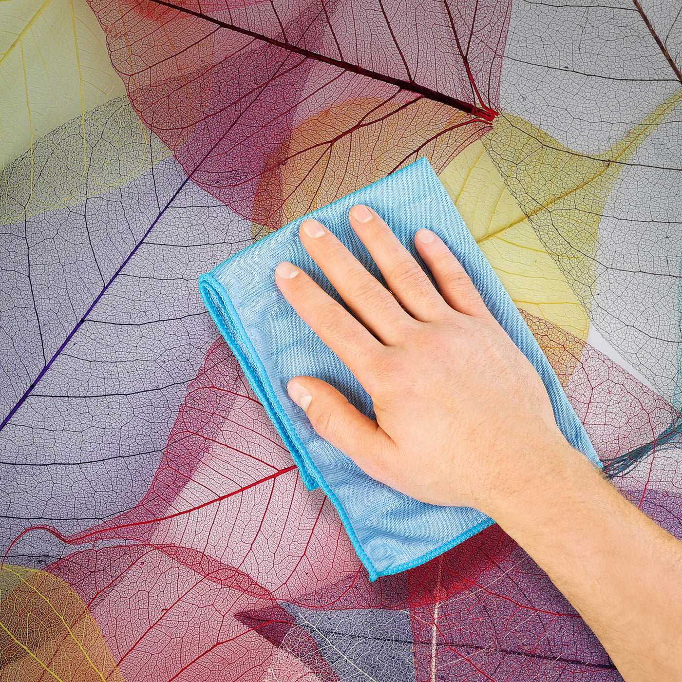- Reinige eventuelle Verschmutzungen oder Kleberreste sofort mit einem feuchten Schwamm oder Tuch.