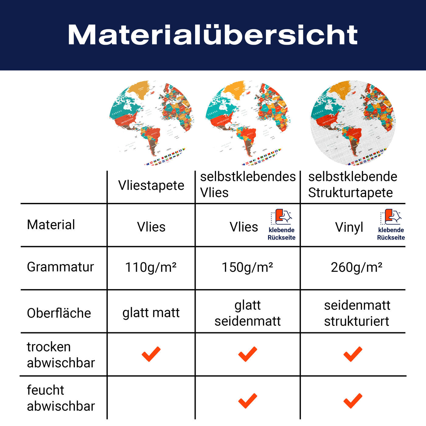 Die Fototapeten sind pflegeleicht und können mit einem feuchten Tuch gereinigt werden, ohne die Farbbrillanz zu beeinträchtigen.