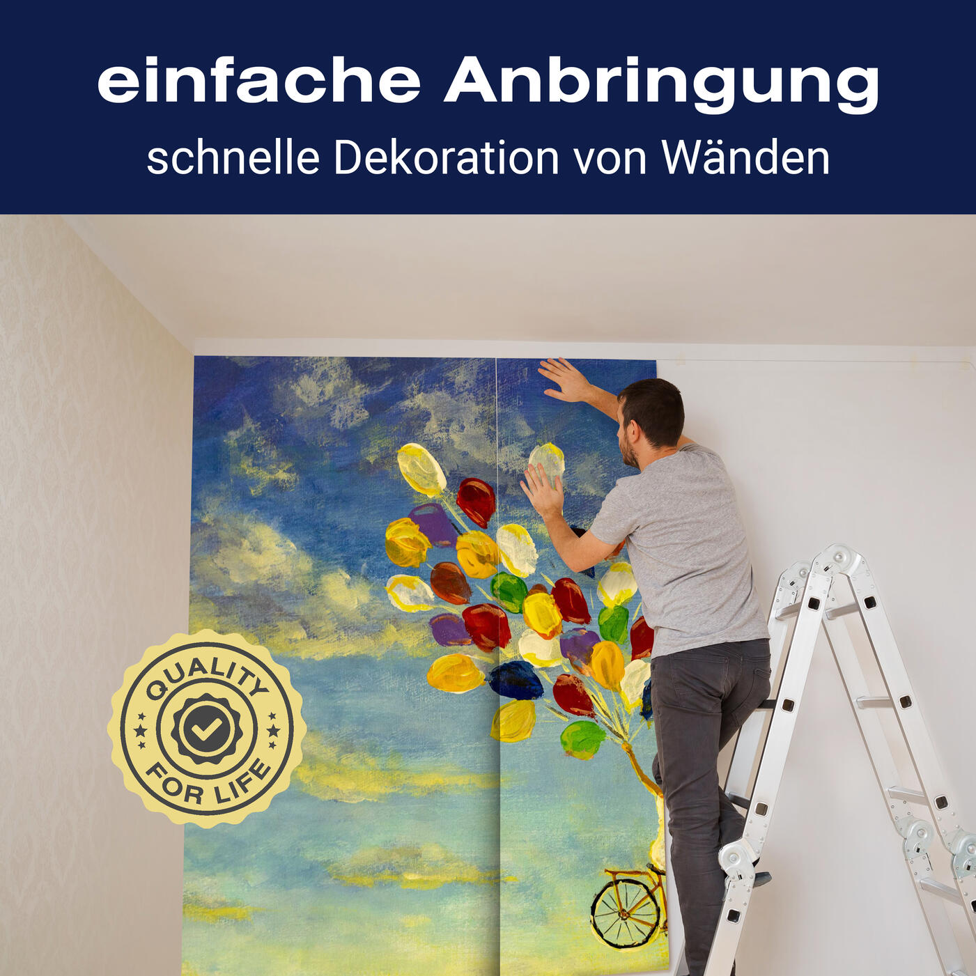 Träumst Du davon, Deine Wände in eine beeindruckende Kunstgalerie zu verwandeln? Mit unserer hochwertigen Fototapete Gemälde Frau mit Luftballons auf Fahrrad M5996 ist es jetzt möglich! Jede Wand wird zu einer Leinwand Deiner Kreativität.
