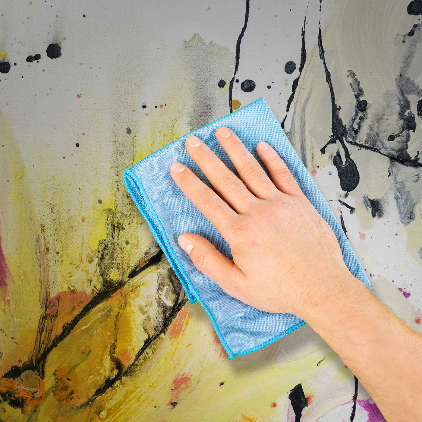 - Reinige eventuelle Verschmutzungen oder Kleberreste sofort mit einem feuchten Schwamm oder Tuch.