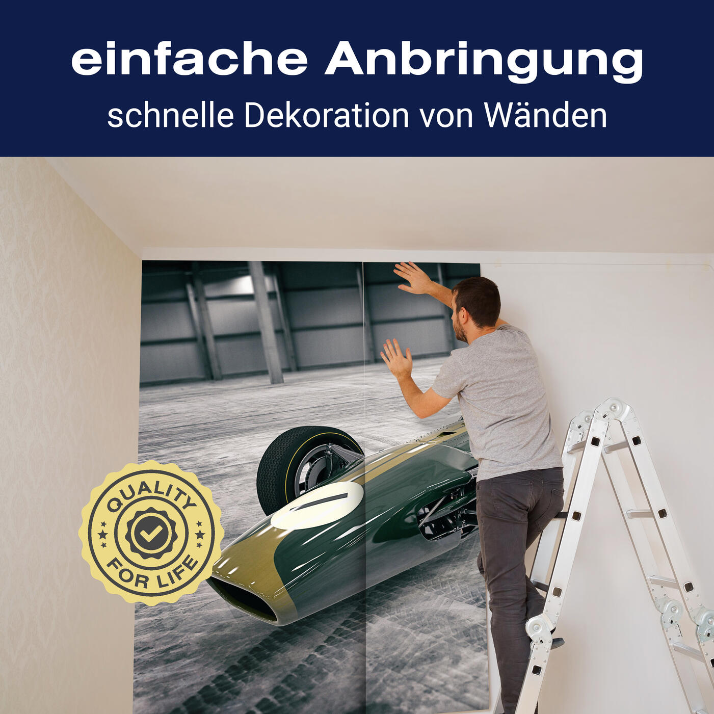 Träumst Du davon, Deine Wände in eine beeindruckende Kunstgalerie zu verwandeln? Mit unserer hochwertigen Fototapete Grüner Oldtimer Rennwagen M5892 ist es jetzt möglich! Jede Wand wird zu einer Leinwand Deiner Kreativität.