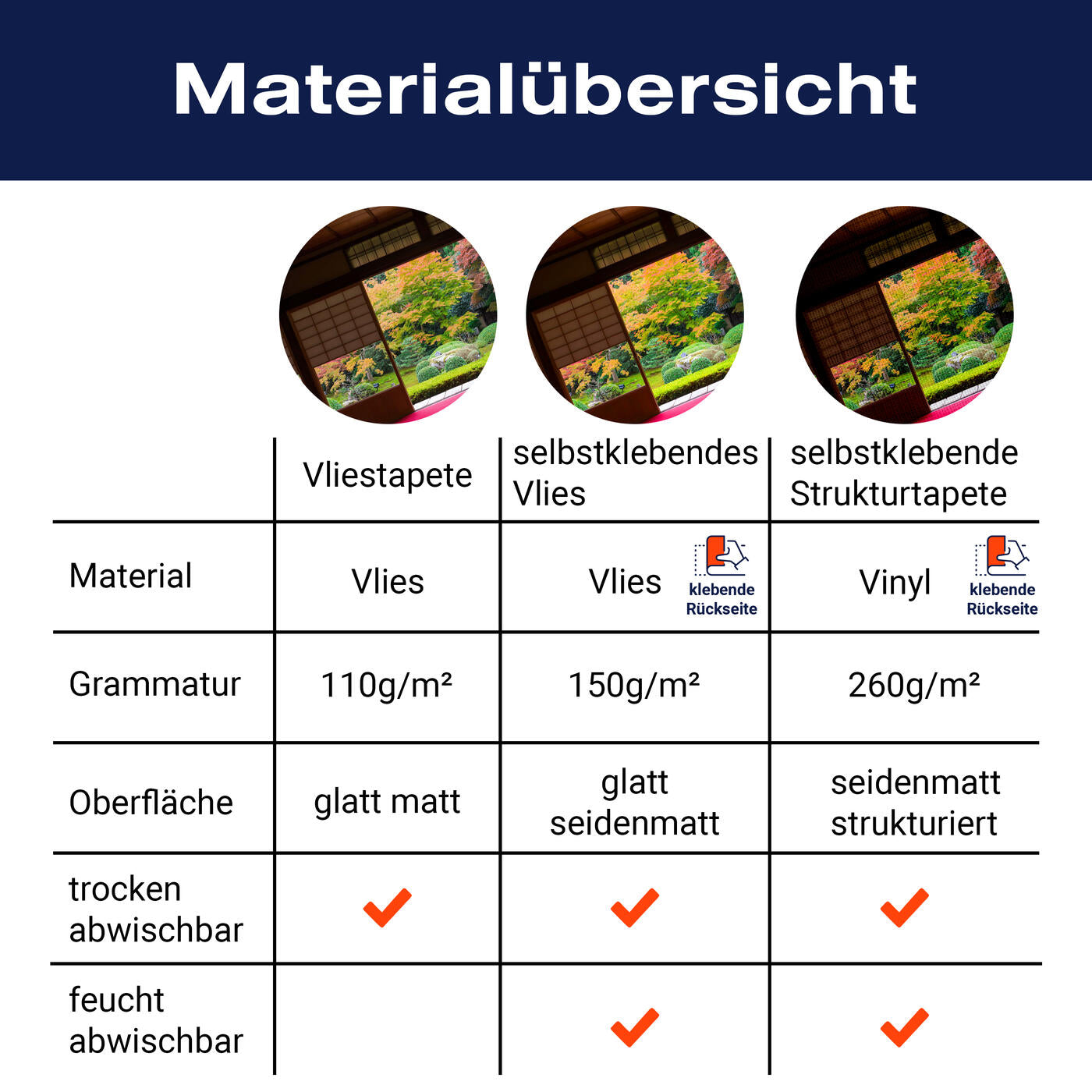 Die Fototapeten sind pflegeleicht und können mit einem feuchten Tuch gereinigt werden, ohne die Farbbrillanz zu beeinträchtigen.