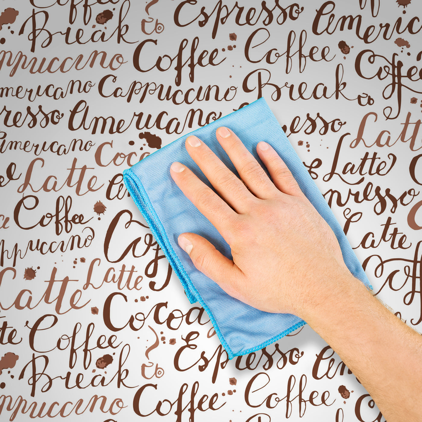 - Reinige eventuelle Verschmutzungen oder Kleberreste sofort mit einem feuchten Schwamm oder Tuch.