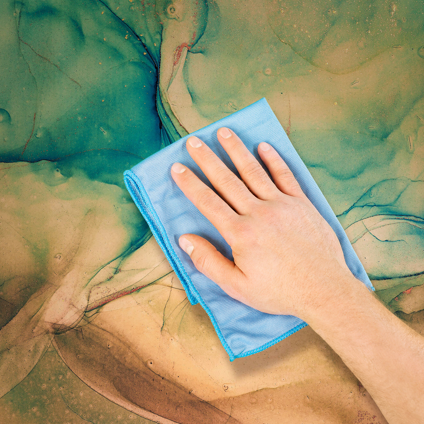 - Reinige eventuelle Verschmutzungen oder Kleberreste sofort mit einem feuchten Schwamm oder Tuch.