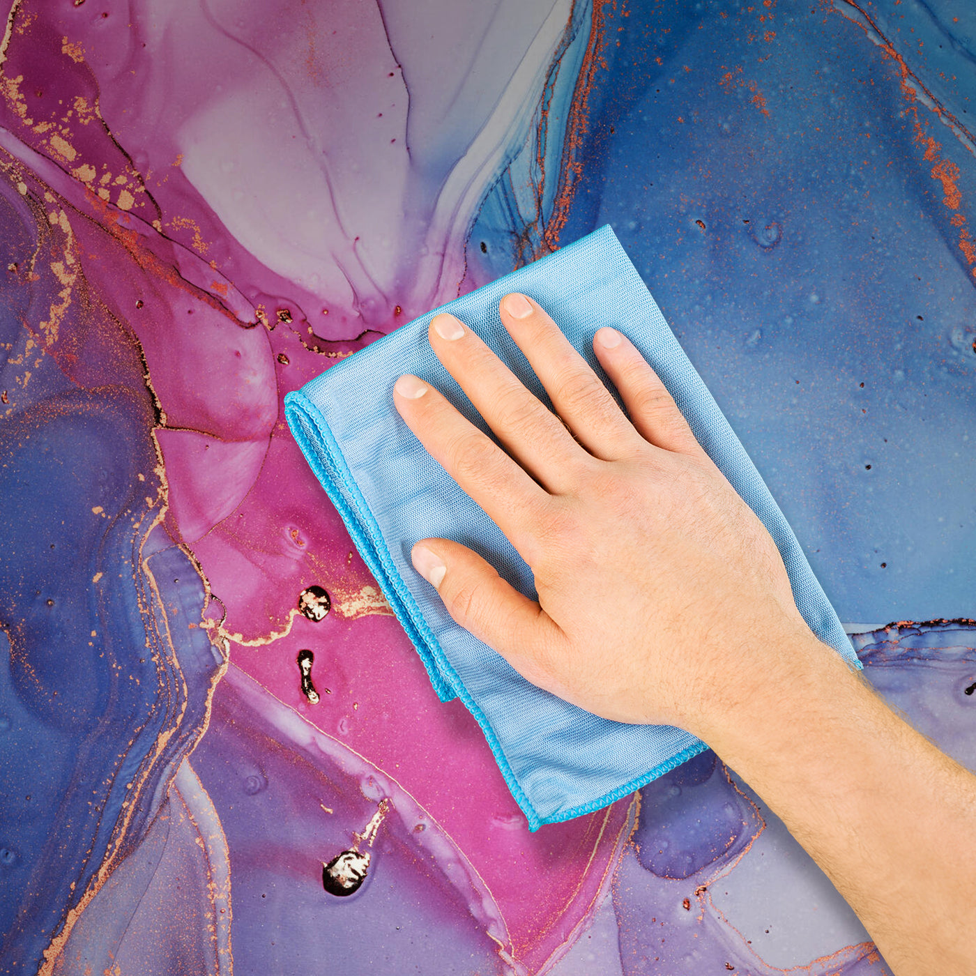 - Reinige eventuelle Verschmutzungen oder Kleberreste sofort mit einem feuchten Schwamm oder Tuch.