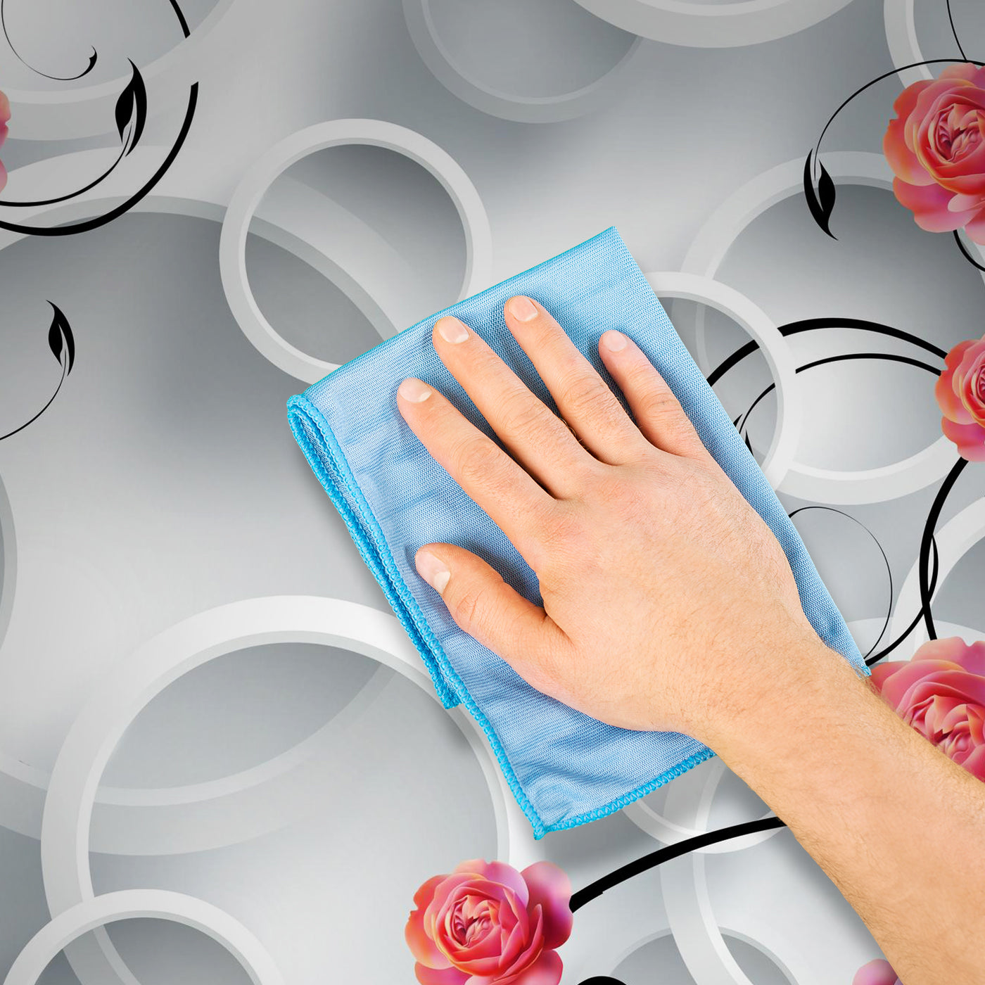- Reinige eventuelle Verschmutzungen oder Kleberreste sofort mit einem feuchten Schwamm oder Tuch.