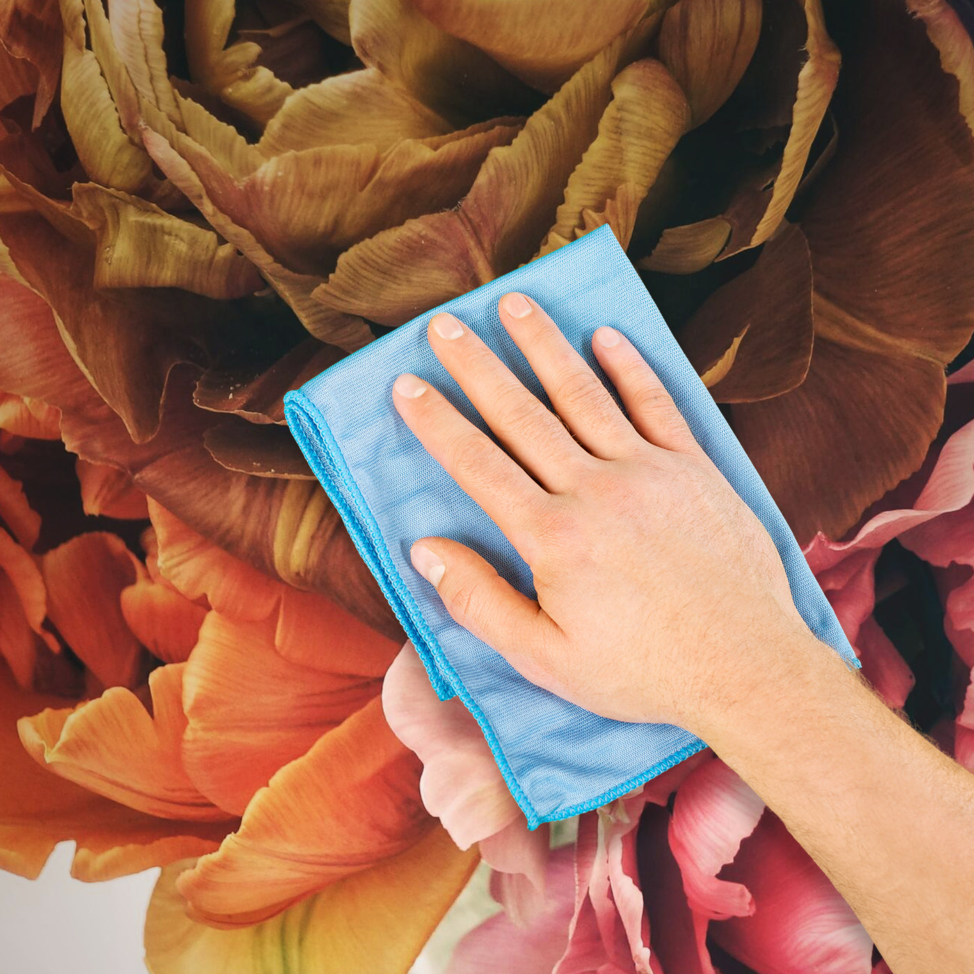 - Reinige eventuelle Verschmutzungen oder Kleberreste sofort mit einem feuchten Schwamm oder Tuch.