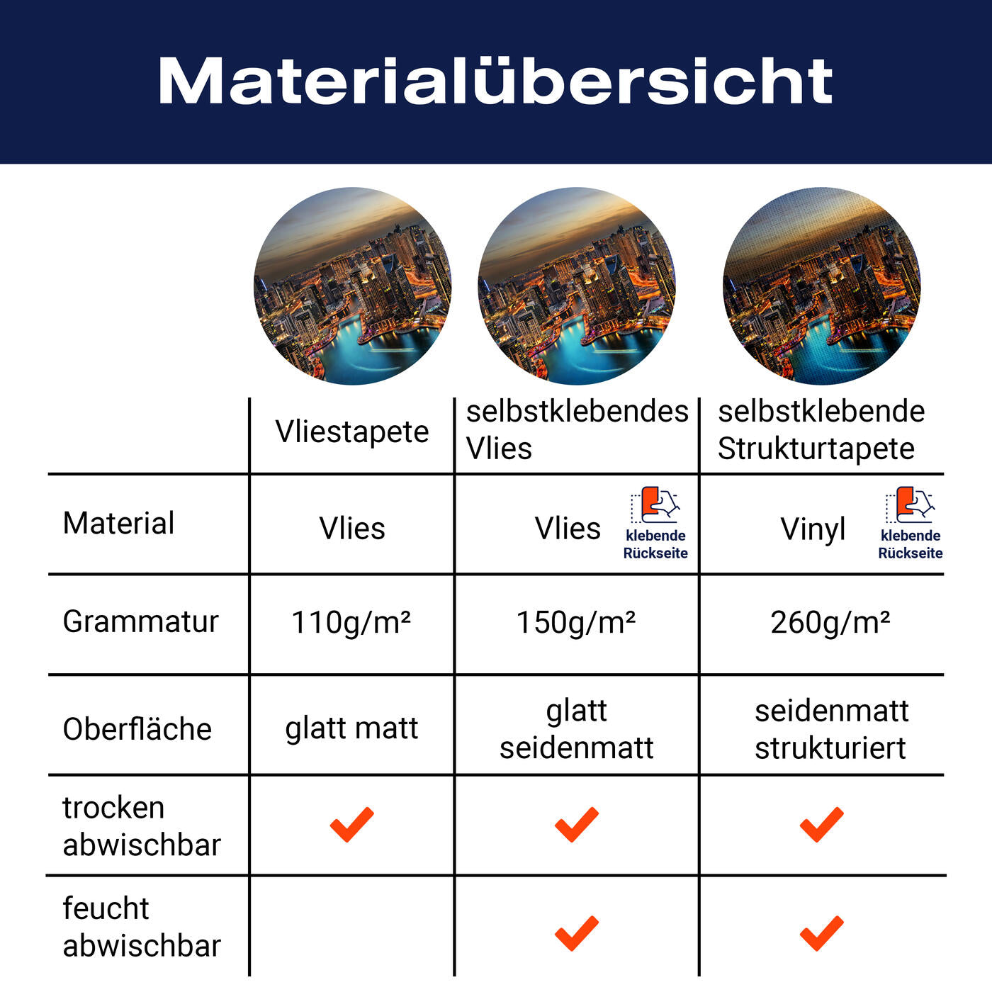 Die Fototapeten sind pflegeleicht und können mit einem feuchten Tuch gereinigt werden, ohne die Farbbrillanz zu beeinträchtigen.
