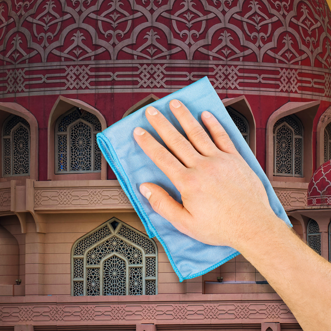 - Reinige eventuelle Verschmutzungen oder Kleberreste sofort mit einem feuchten Schwamm oder Tuch.