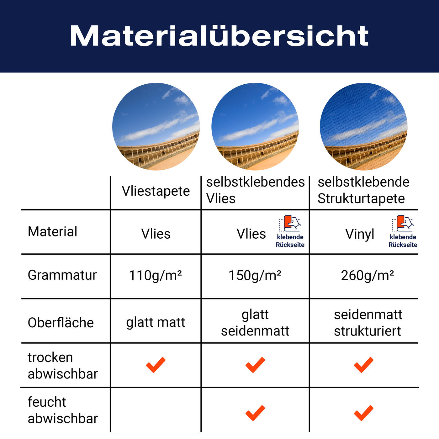Fototapeten können auf den meisten glatten, sauberen und trockenen Oberflächen angebracht werden. Sie eignen sich gut für gestrichene Wände, Gipskarton, Putz oder Holzoberflächen. Es ist wichtig sicherzustellen, dass die Wand vor der Anbringung der Fototapete frei von Schmutz, Staub oder Unebenheiten ist, um eine optimale Haftung zu gewährleisten.