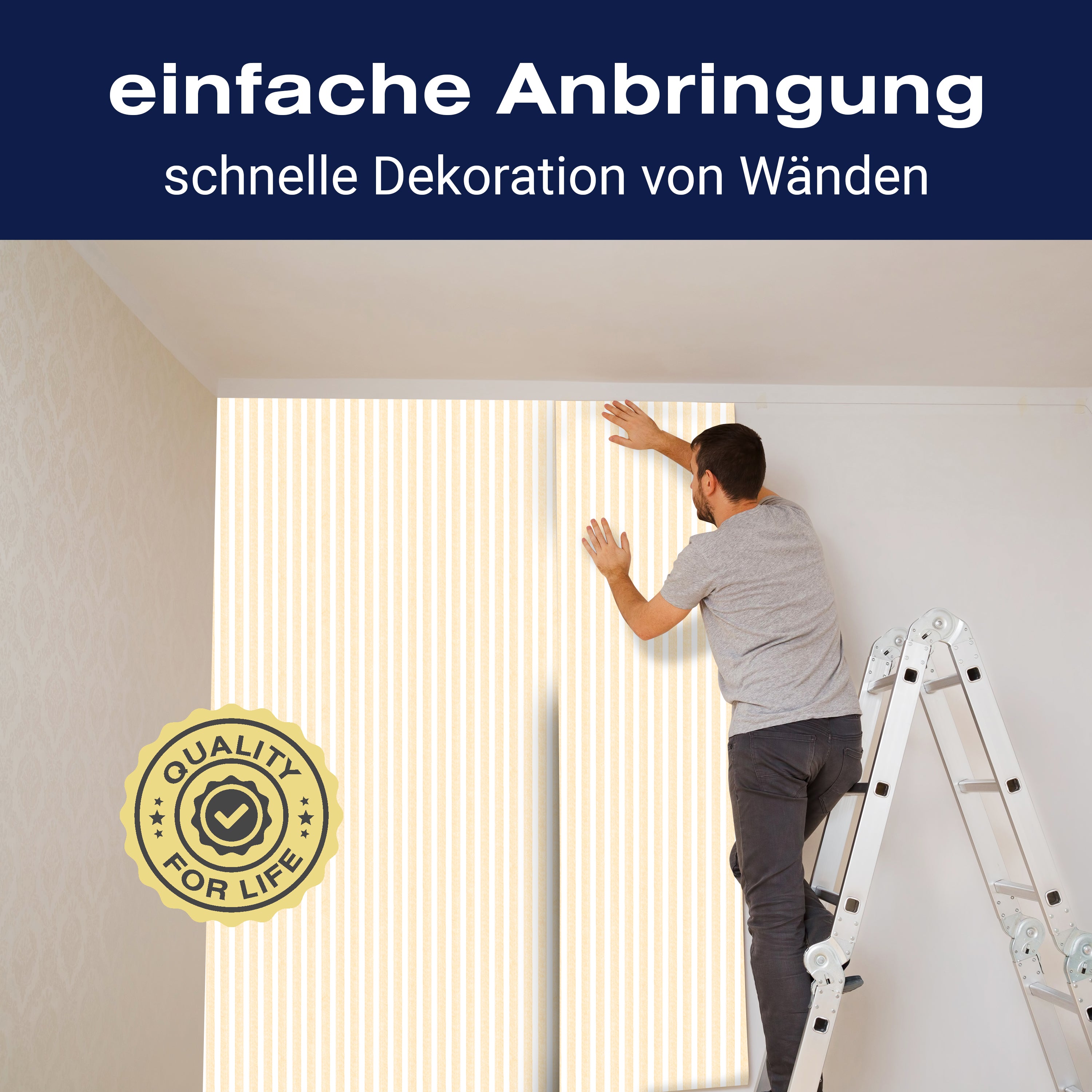 - Wenn deine Fototapete aus mehreren Bahnen besteht, achte darauf, dass die Motive oder das Design sauber und nahtlos ineinander übergehen. Achte dabei auf die Anweisungen des Herstellers oder auf eventuelle Markierungen auf der Tapete selbst.