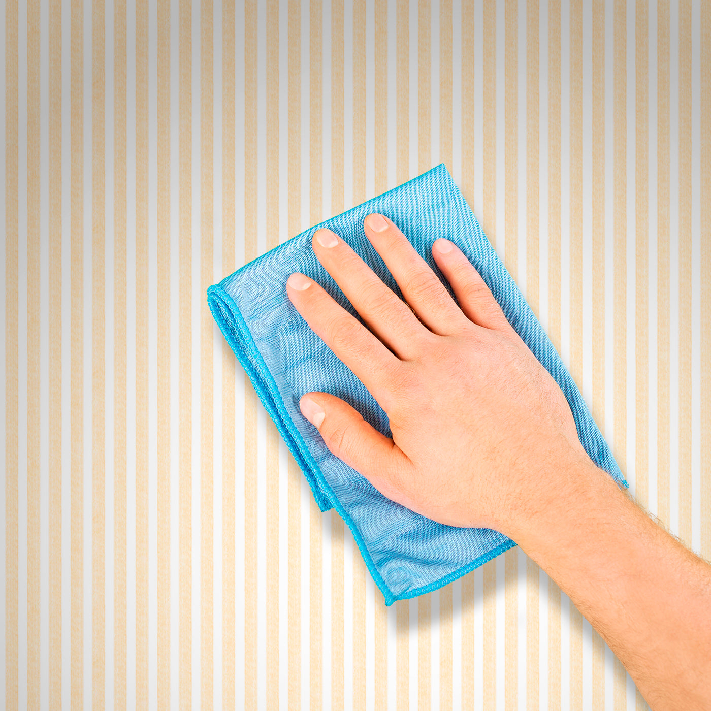 - Reinige eventuelle Verschmutzungen oder Kleberreste sofort mit einem feuchten Schwamm oder Tuch.