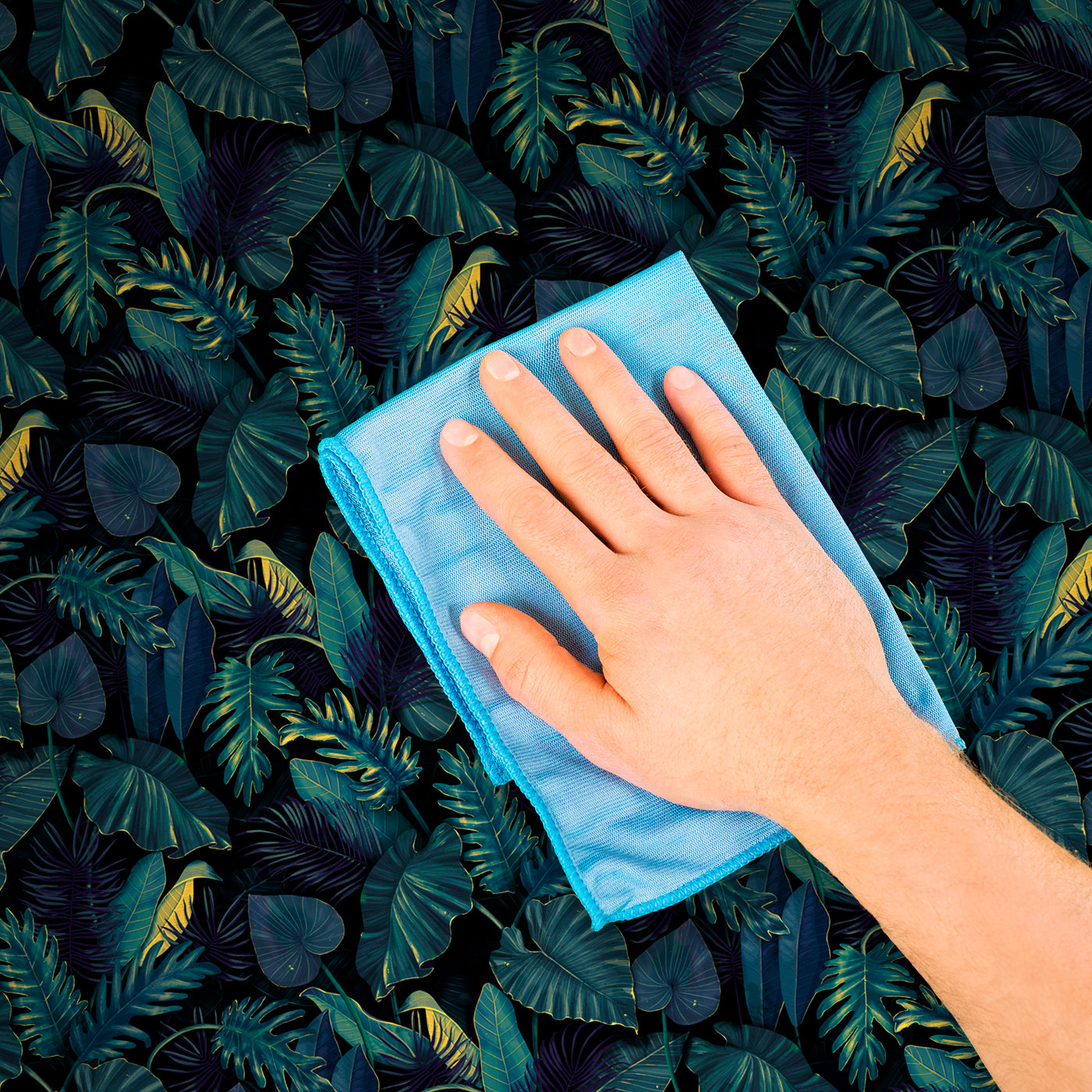 - Reinige eventuelle Verschmutzungen oder Kleberreste sofort mit einem feuchten Schwamm oder Tuch.