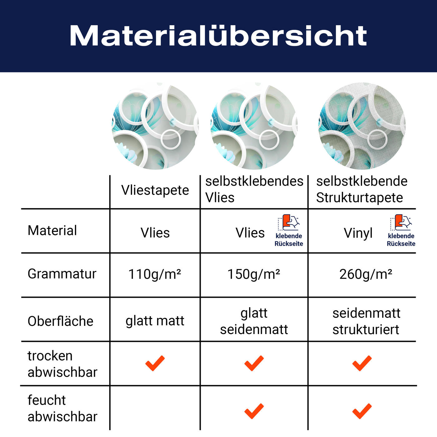 - Selbstklebendes Vlies 150g/m²: Einfach anzubringen, perfekt für Mietwohnungen.