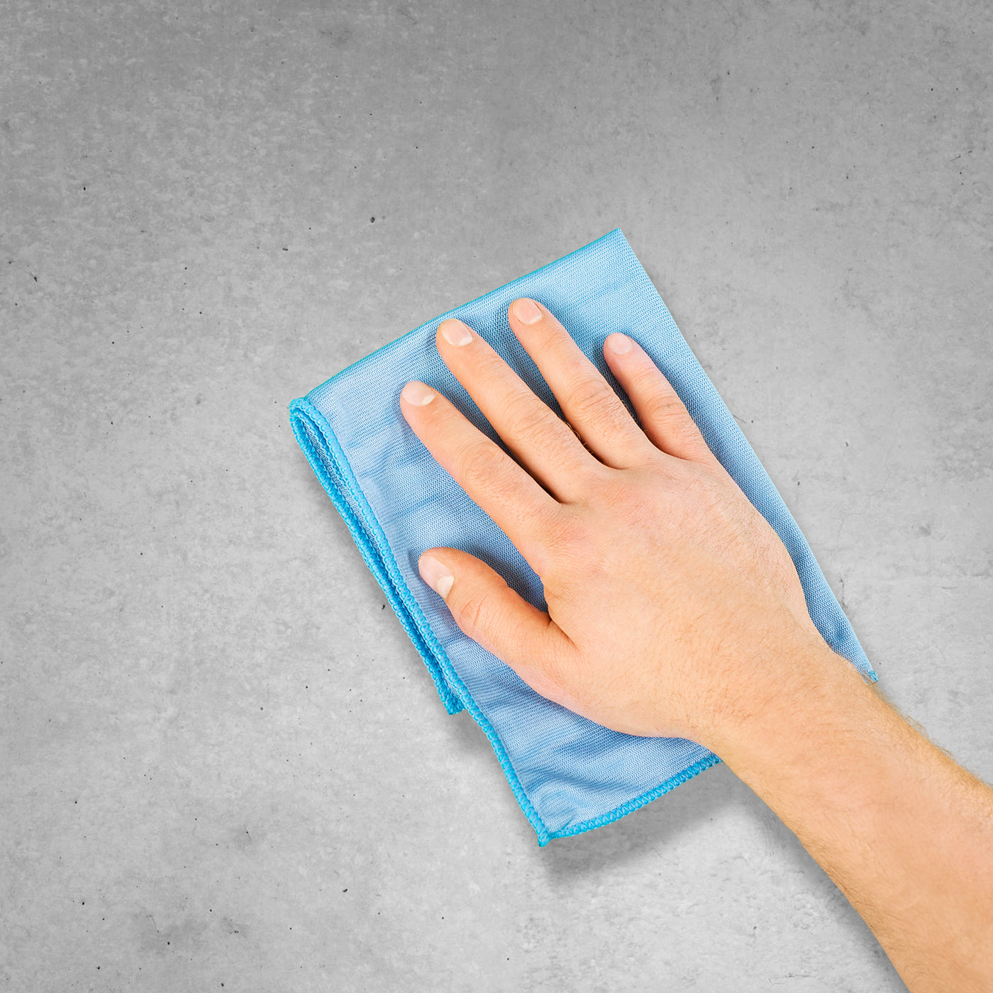 - Reinige eventuelle Verschmutzungen oder Kleberreste sofort mit einem feuchten Schwamm oder Tuch.